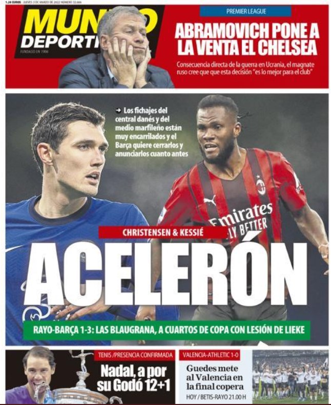 Il Barcellona accelera per Kessie (e Christensen). A riportare la notizia, con tanto di titolone in prima pagina, è il Mundo Deportivo, che spiega che il club blaugrana sta puntando con decisione sul centrocampista in scadenza di contratto con il Milan. L'operazione non è ancora chiusa, ma le trattative sono in stato avanzato. L'obiettivo del Barça è definire l'affare il prima possibile. Secondo il quotidiano spagnolo, l'annuncio della nuova destinazione di Kessie (accostato anche all'Inter) potrebbe contribuire a spegnere le polemiche, aiutando il giocatore a concentrarsi sul Milan fino al termine della stagione