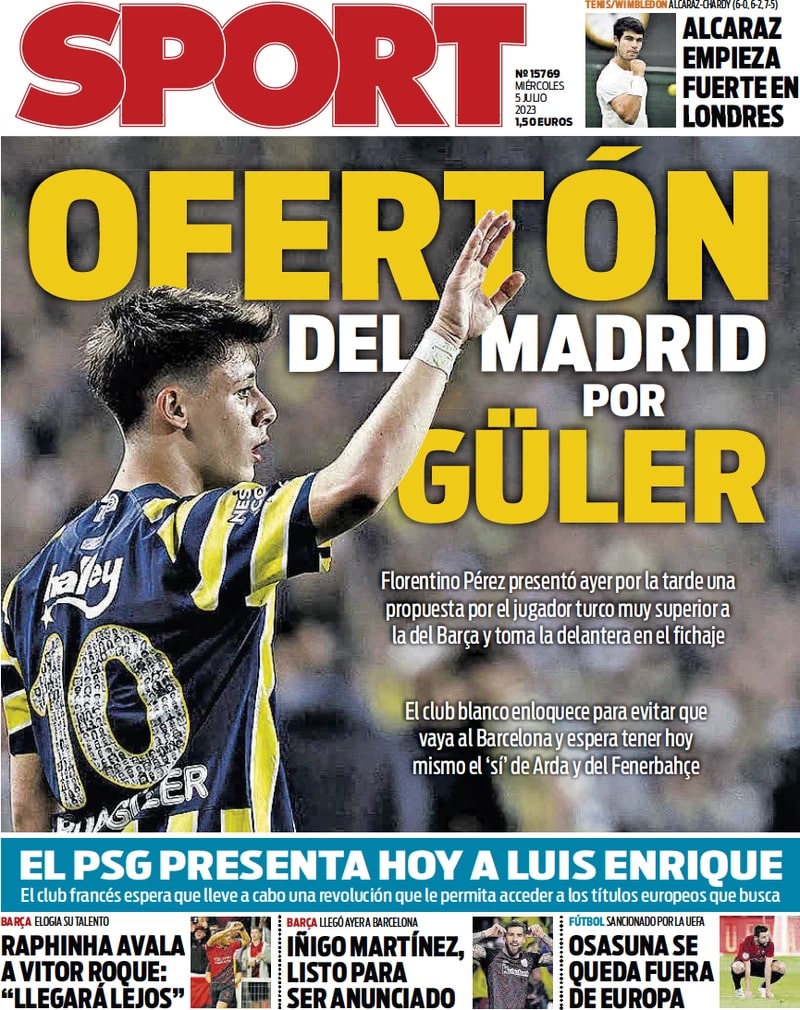 Le prime pagine dei principali quotidiani spagnoli in edicola oggi, mercoledì 5 luglio 2023, si concentrano sulle trattative più calde di questo mercato. Tutti i giornali concordano: il Real Madrid sta puntando con forza e decisione Arda Güler, centrocampista turco e gioiellino del Fenerbahçe accostato anche al Milan nelle ultime settimane.