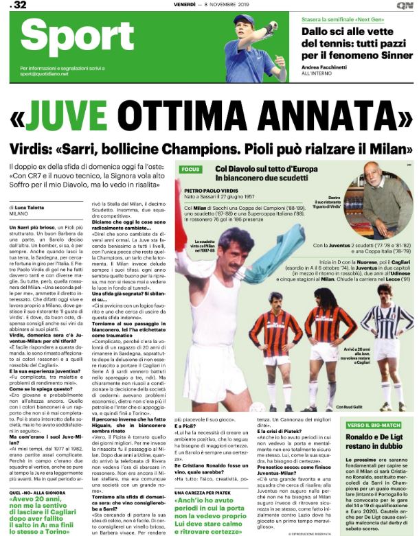 Il QN ha intervistato in esclusiva Pietro Paolo Virdis, doppio ex della sfida tra Juventus e Milan di domenica sera, ed apre la sua sezione sportiva con le sue parole: "Bianconeri ottima annata". Il suo lavoro oggi è l'oste: "Con CR7 e il nuovo tecnico la Signora vola in alto. Soffro per il Diavolo, ma lo vedo in risalita".