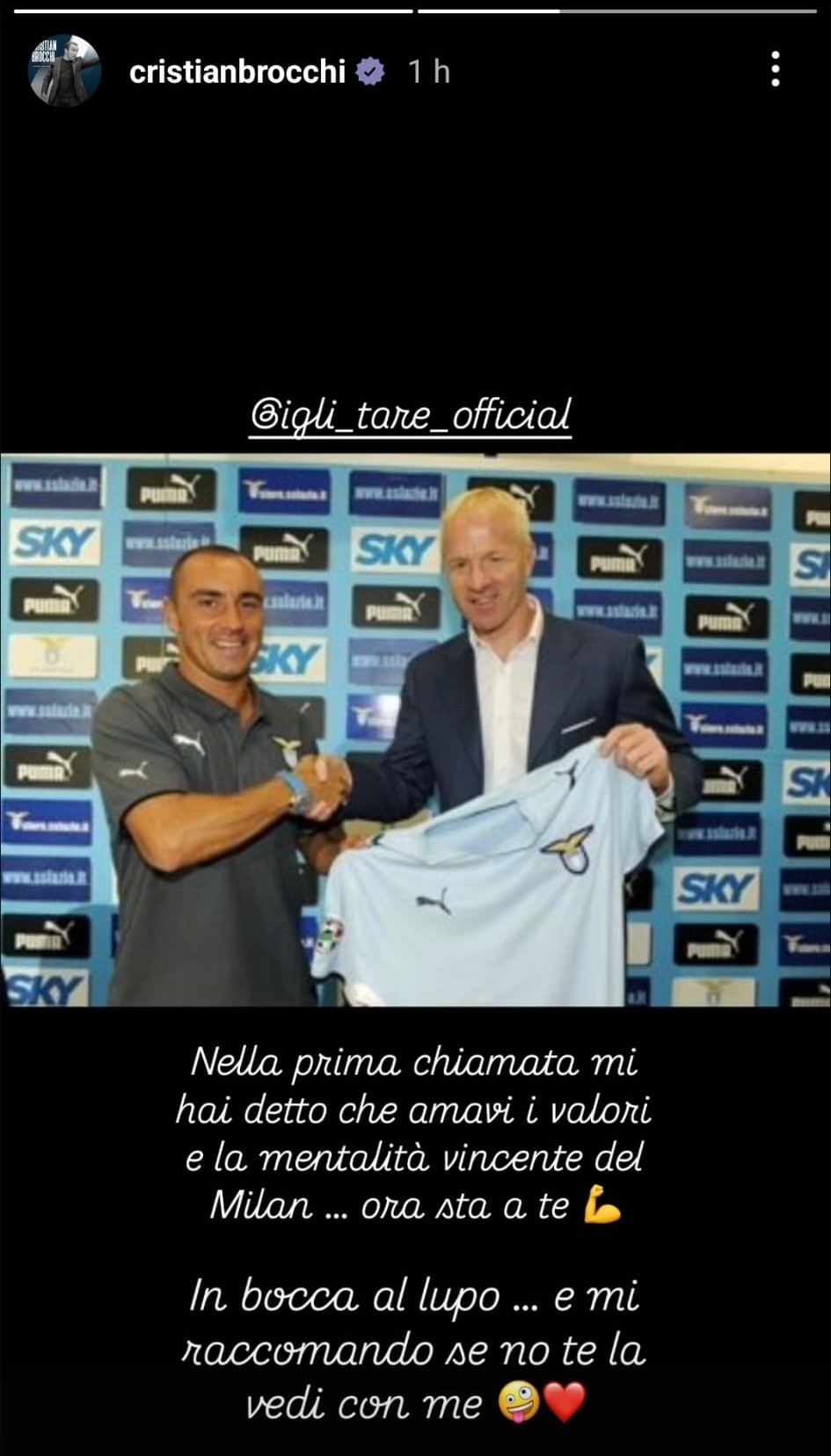 Cristian Brocchi, ex giocatore di Milan e Lazio, ha pubblicato una storia su Instagram nella quale ha voluto augurare buon lavoro a Igli Tare come nuovo direttore sportivo rossonero: "Nella prima chiamata mi hai detto che amavi i valori e la mentalità vincente del Milan... Ora sta a te. In bocca al lupo... E mi raccomando se no te la vedi con me".