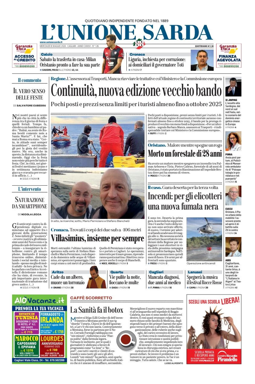Si parla anche di calcio oggi in prima pagina su L'Unione Sarda, con il seguente titolo presente in taglio alto: "Sabato trasferta in casa-Milan: Oristanio pronto a fare la sua parte". Dopo aver pareggiato col Lecce, i rossoblù sfidano i rossoneri di Pioli. In palio punti pesanti per la squadra di Ranieri, ancora pienamente coinvolta nella lotta per non retrocedere. Quasi un derby per il centrocampista offensivo classe 2002, cresciuto nelle giovanili dell'Inter.