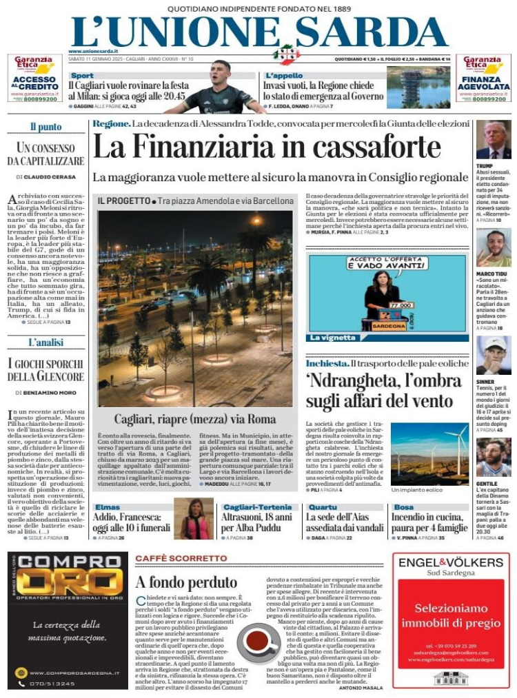 "Il Cagliari vuole rovinare la festa al Milan: si gioca oggi alle 20.45". Questo il titolo in taglio alto di prima pagina dell'edizione odierna de L'Unione Sarda. A San Siro, nella sera in cui la squadra di Conceiçao festeggia la conquista della Supercoppa Italiana, la squadra di Davide Nicola cerca punti importanti per cercare di staccare le zone basse della classifica.