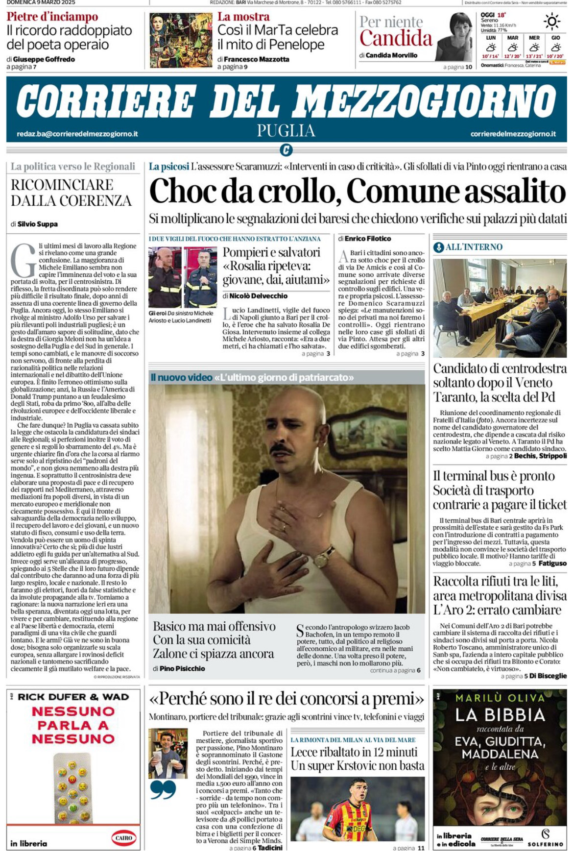 L'edizione pugliese del Corriere del Mezzogiorno riporta in prima pagina la sconfitta in rimonta subita dal Lecce contro il Milan. Al Via del Mare, nonostante due gol annullati ai rossoneri per fuorigioco, è il Lecce a passare in vantaggio con la rete di Nikola Krstovic, a cui è seguita la doppietta personale del centravanti serbo nel secondo tempo.