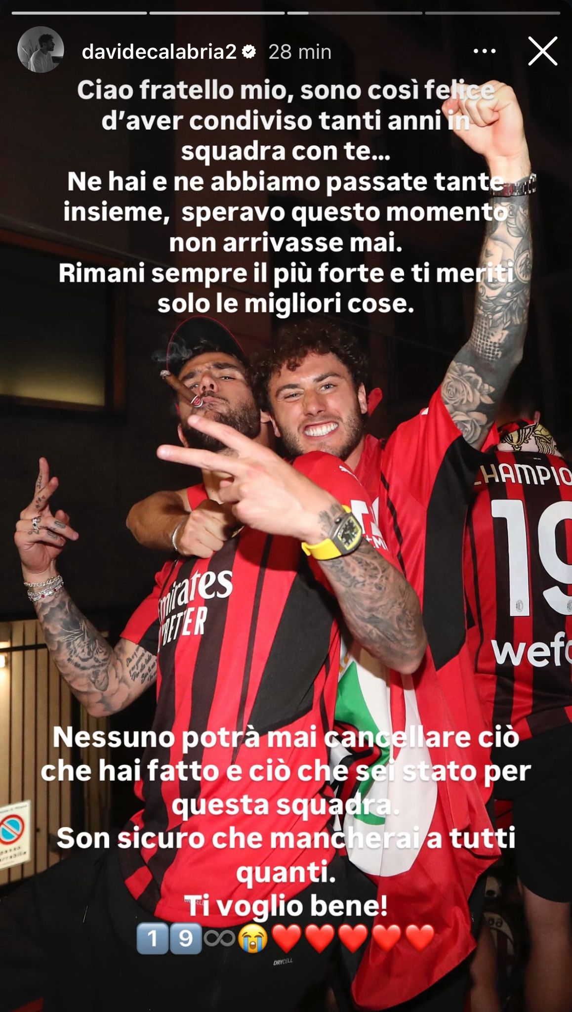 Theo Hernandez è ufficialmente un nuovo giocatore dell'Al-Hilal. Con una bella foto pubblicata nelle proprie stories Instagram, l'ex capitano del Milan Davide Calabria ha voluto augurare il meglio al suo compagno di mille battaglie (vittorie e delusioni) in rossonero. Questo il messaggio allegato all'immagine: