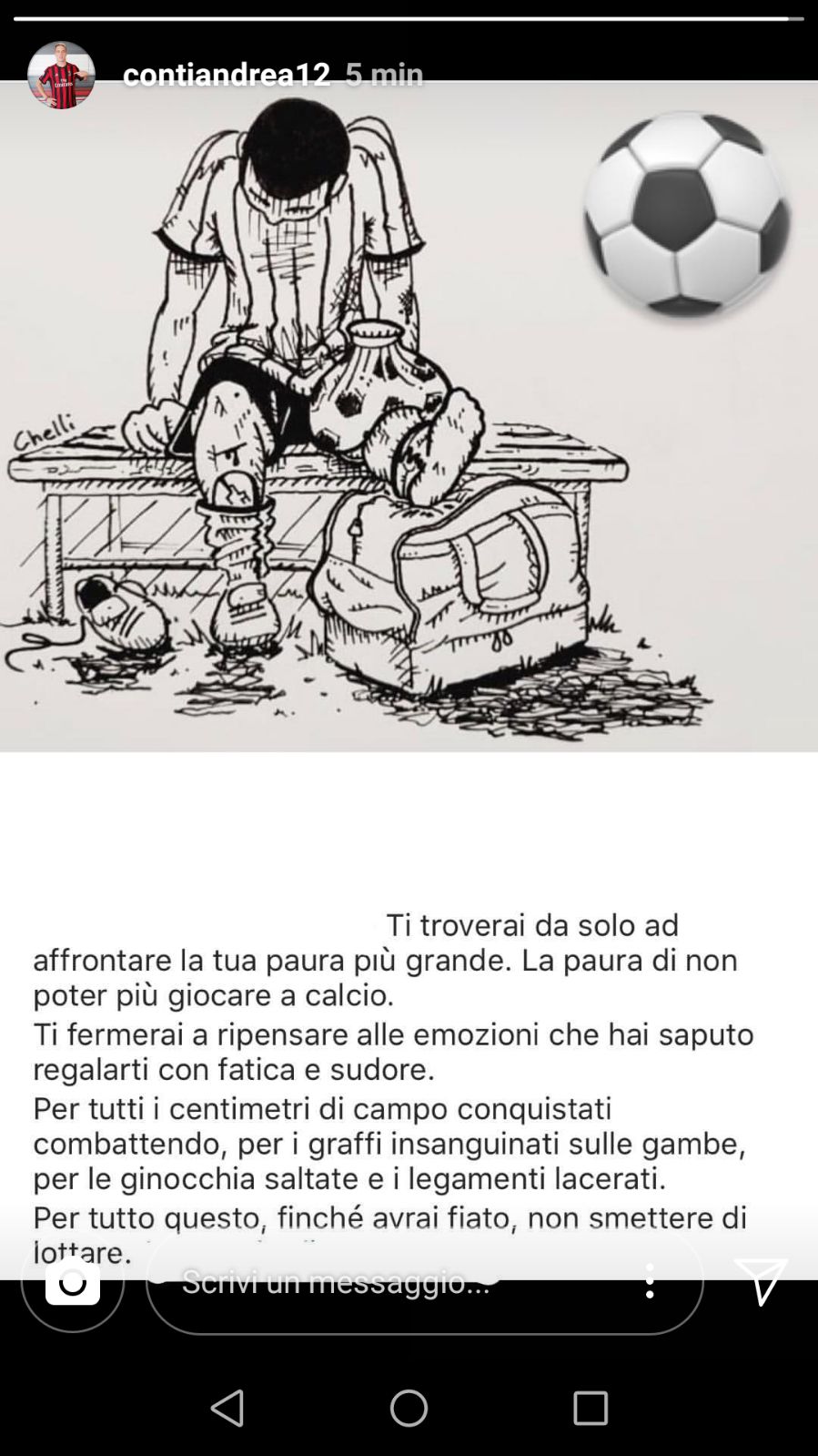 Andrea Conti è ricaduto nell'infortunio al ginocchio. Il terzino rossonero, nelle Instagram Stories, ha postato un messaggio toccante messaggio motivazionale: "Ti troverai da solo ad affrontare la tua paura più grande. La paura di non poter più giocare a calcio. Ti fermerai a ripensare alle emozioni che hai saputo regalarti con fatica e sudore. Per tutti i centimetri di campo conquistati combattendo, per i graffi insanguinati sulle gambe, per le ginocchie saltate e i legamenti lacerati. Per tutto questo, finchè avrai fiato, non smettere di lottare".