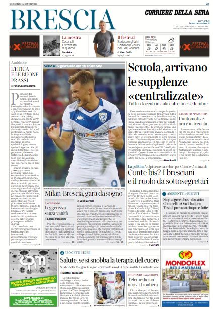 Alle 18 a San Siro va in scena il primo anticipo del sabato tra Milan e Brescia. Derby lombardo e, soprattutto, "Gara da sogno", come titola in prima pagina il Corriere di Brescia. Dopo l'esordio vincente a Cagliari, la formazione di Eugenio Corini è chiamato ad una prova ancor più difficile e torna alla Scala del Calcio per affrontare il grande ex Marco Giampaolo.