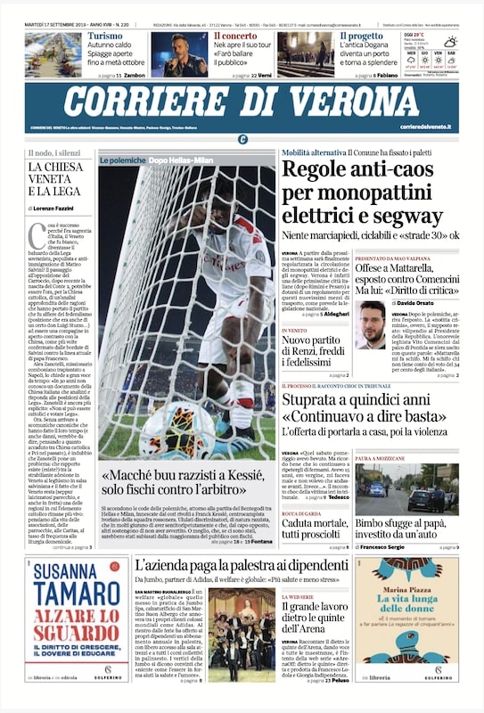 Apertura del Corriere di Verona dedicata alle polemiche post Hellas Verona-Milan. "Macché buu razzisti a Kessié, solo fischi contro l’arbitro" scrive il quotidiano in prima pagina. Si accendono le code delle polemiche, attorno alla partita del Bentegodi tra Hellas e Milan, innescate dai cori rivolti a Franck Kessié. Ululati discriminatori, di natura razzista, che in molti giurano di aver sentitoripetutamente e che, dal capo opposto, altri sostengono di non aver avvertito. O meglio, che, se ci sono stati, sarebbero stati subissati dalla maggioranza del pubblico con fischi. La polemica prosegue.