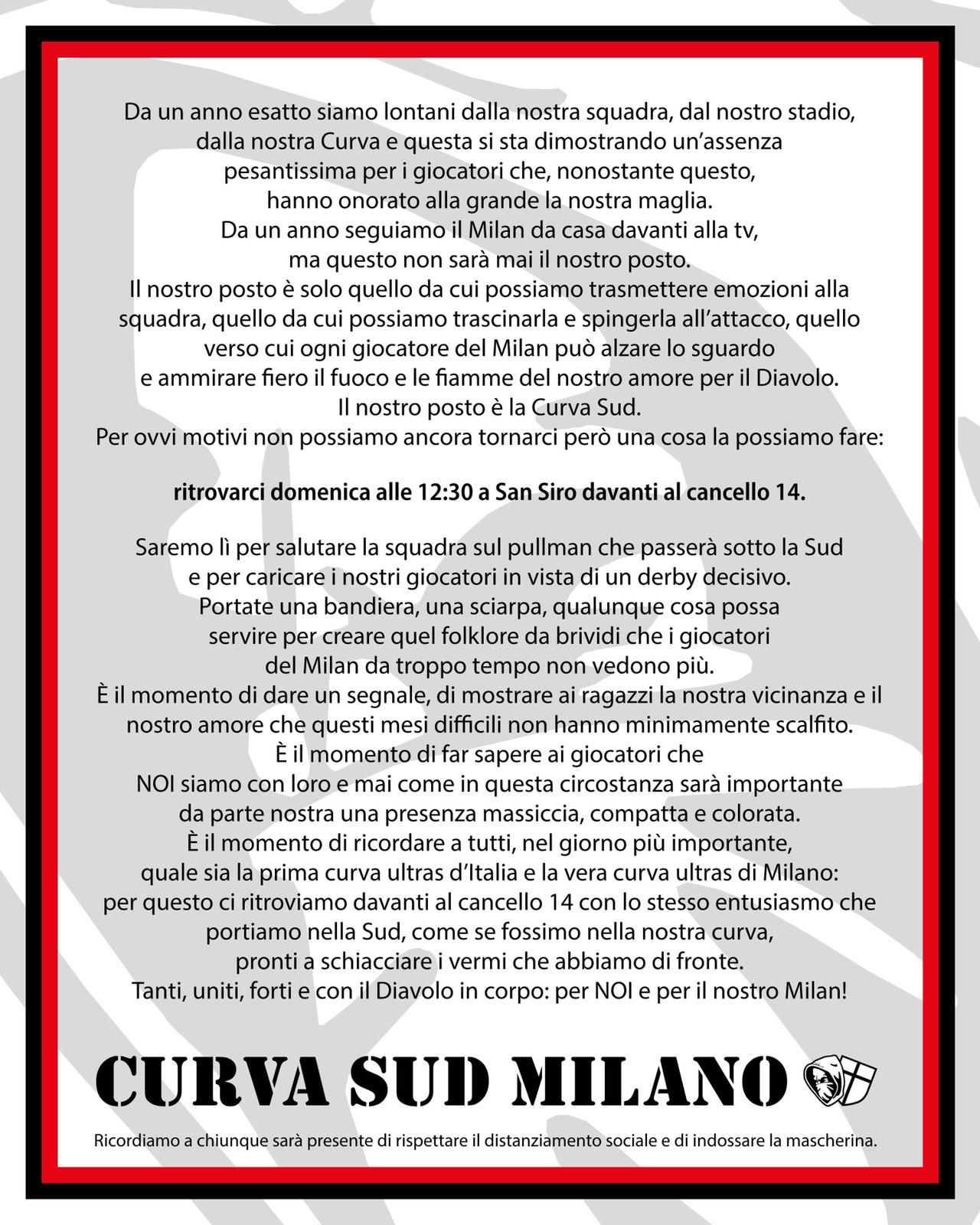 La Curva Sud Milano, ovviamente, non potrà essere presente sugli spalti di San Siro a incitare i rossoneri di Pioli. Tuttavia, gli ultras vogliono far sentire il loro calore alla squadra. Ecco il comunicato diffuso dal tifo organizzato milanista con i dettagli del ritrovo: