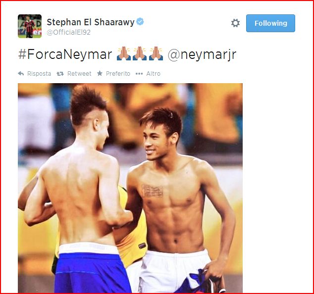 Anche Stephan El Shaarawy ha voluto dedicare un messaggio su Twitter a Neymar, che ieri sera si è infortunato in Brasile-Colombia e ha dovuto così dire addio al Mondiale: l'attaccante rossonero ha pubblicato sul proprio profilo personale una foto insieme al giocatore verdeoro del Barcellona e la scritta "ForcaNeymar".