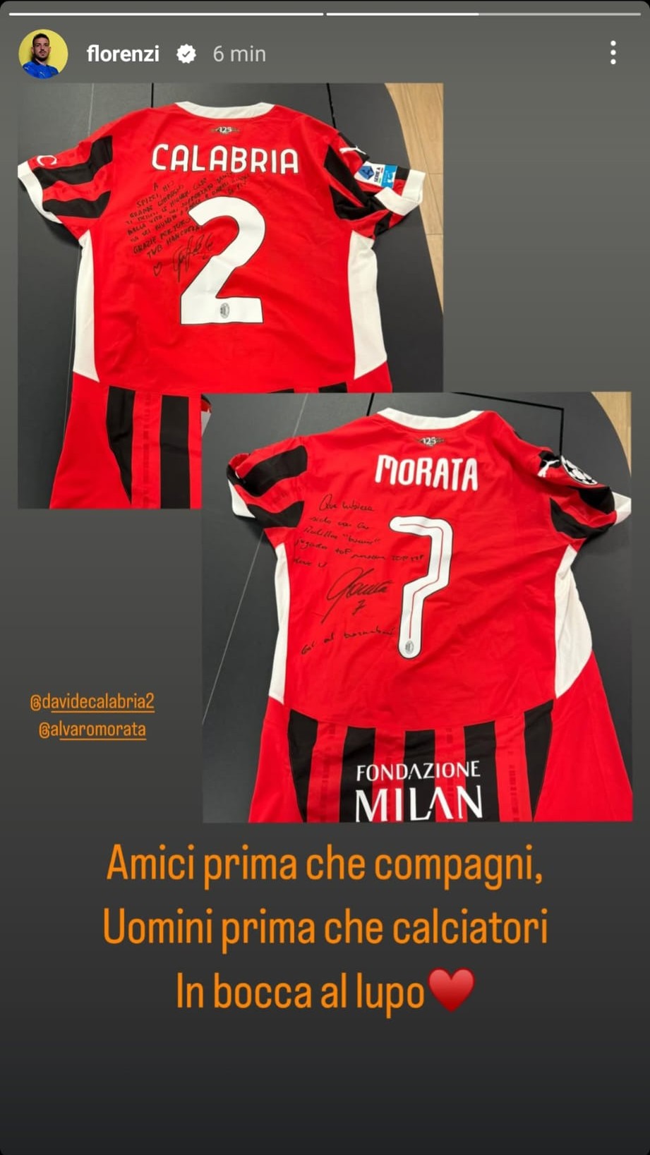 Nelle scorse ore il Milan ha ceduto sia Davide Calabria, che è andato al Bologna, che Alvaro Morata, che si è invece trasferito in Turchia al Galatasaray. Alessandro Florenzi ha dedicato ai suoi ex compagni di squadra una storia su Instagram con questo messaggio: "Amici prima che compagni, uomini prima che calciatori. In bocca al lupo".