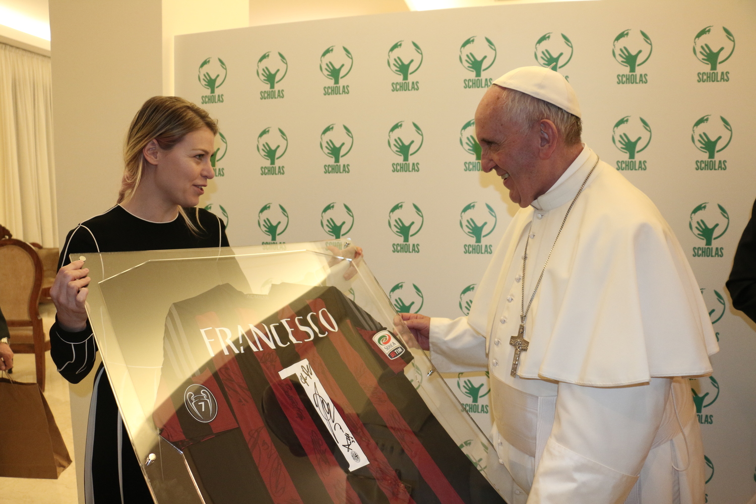 Nel pomeriggio di oggi Barbara Berlusconi, Amministratore delegato del Milan, è stata ricevuta da Papa Francesco in un'udienza privata, svoltasi presso la residenza del Pontefice a Casa Santa Marta in Vaticano. La visita è stata organizzata da Scholas Occurrentes, l’organizzazione internazionale di diritto pontificio nata su iniziativa del Santo Padre con l’obiettivo di promuovere l’integrazione e favorire la pace tra i popoli e di proseguire nell'iniziativa dei derby per la pace con Boca Juniors, River Plate, Atlético Madrid, San Lorenzo de Almagro e Huracán. Ecco le foto:
