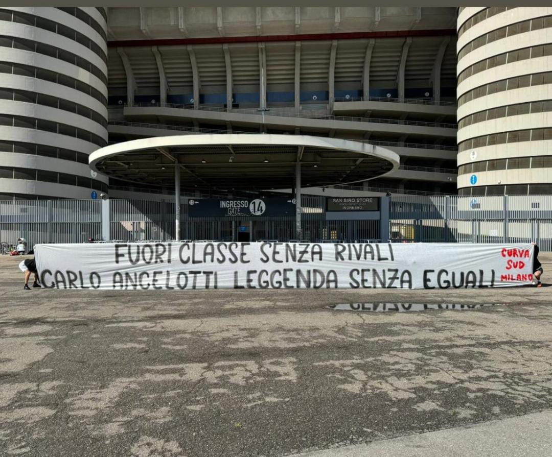 "Fuoriclasse senza rivali, Carlo Ancelotti leggenda senza eguali". Con questo striscione, immortalato fuori dal gate 14 di San Siro, la Curva Sud Milano ha voluto rendere omaggio a Carlo Ancelotti, che ieri sera ha vinto con il Real Madrid la settima Champions League della sua incredibile carriera (2 da giocatore e 5 da calciatore).