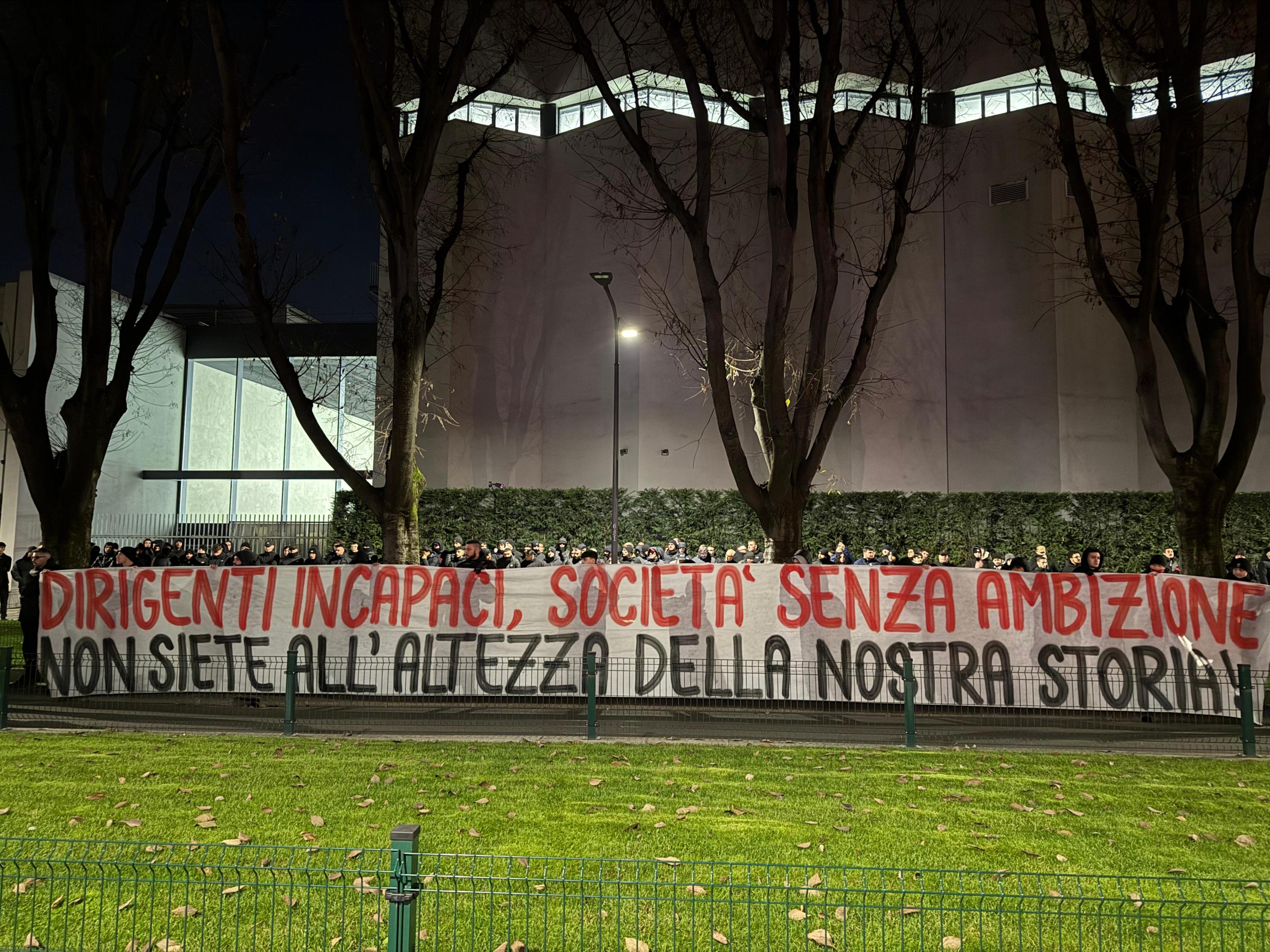La contestazione dei tifosi del Milan continua. Fuori dal luogo dove oggi la società con dirigenti, giocatori, leggende e altri invitati celebrerà il 125° anniversario del club con una cena di gala, si stanno ritrovando i sostenitori rossoneri che in maniera pacifica daranno continuità alla protestsa di ieri sera avvenuta fuori dallo stadio dopo il pareggio contro il Genoa. Già due gli striscioni esposti. Uno già apparso ieri: "Dirigenti incapaci, società senza ambizione. Non siete all'altezza della nostra storia". Un altro, nuovo, attacca i giocatori: "Giocatori senza voglia e dignità, siete lo specchio di questa proprietà".