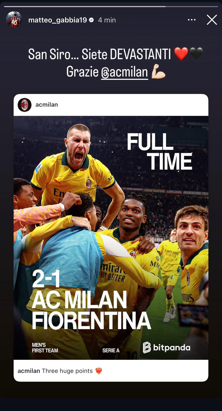 Una vittoria importante, che combacia con il ritorno al gol in casa in campionato di Leao ma soprattutto del tifo organizzato al suo 100%, vista la presenza di striscioni e bandiere. E festeggiando sui social per la vittoria di questa sera Matteo Gabbia ci ha tenuto a precisare questa cosa, repostando un post del Milan scrivendo: "San Siro...Siete DEVASTANTI! Grazie Milan".