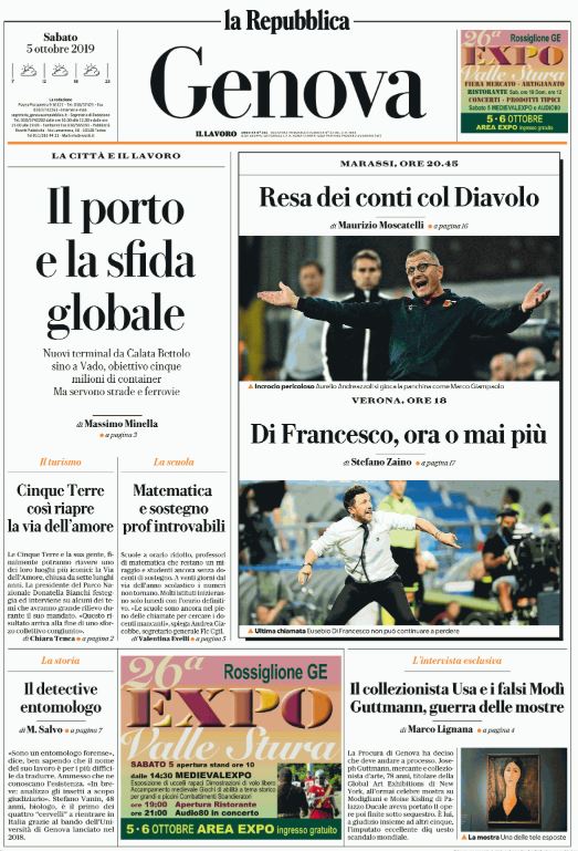 L’edizione di Genova del quotidiano La Repubblica dedica ampio spazio in prima pagina al match in programma questa sera a Marassi. "Resa dei conti col Diavolo", titola il noto quotidiano parlando ovviamente del Genoa. "Incrocio pericoloso - si legge - Aurelio Andreazzoli si gioca la panchina come Marco Giampaolo".