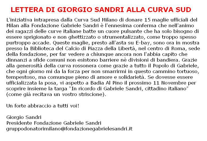 Continua il grande sodalizio instaurato tra la curva Sud Milano e la Fondazione Gabriele Sandri. Dopo la donazione di 15 maglie ufficiali, che erano state regalate agli ultras dal mister Allegri e da Massimo Ambrosini dopo il rinvio della prima giornata di campionato a causa dello sciopero dei calciatori, i responsabili gruppo "Donatori volontari sangue - Gabriele Sandri"hanno indetto, tramite una locandina che riportiamo qui a fianco, per venerdì 11 novembre, ossia il quarto anniversario dell’assassinio di Badia al Pino, la giornata per la donazione di sangue. Lo stesso Giorgio Sandri, padre di Gabriele, ha scritto una toccante lettera di ringraziamento alla Sud che riportiamo qui sotto.