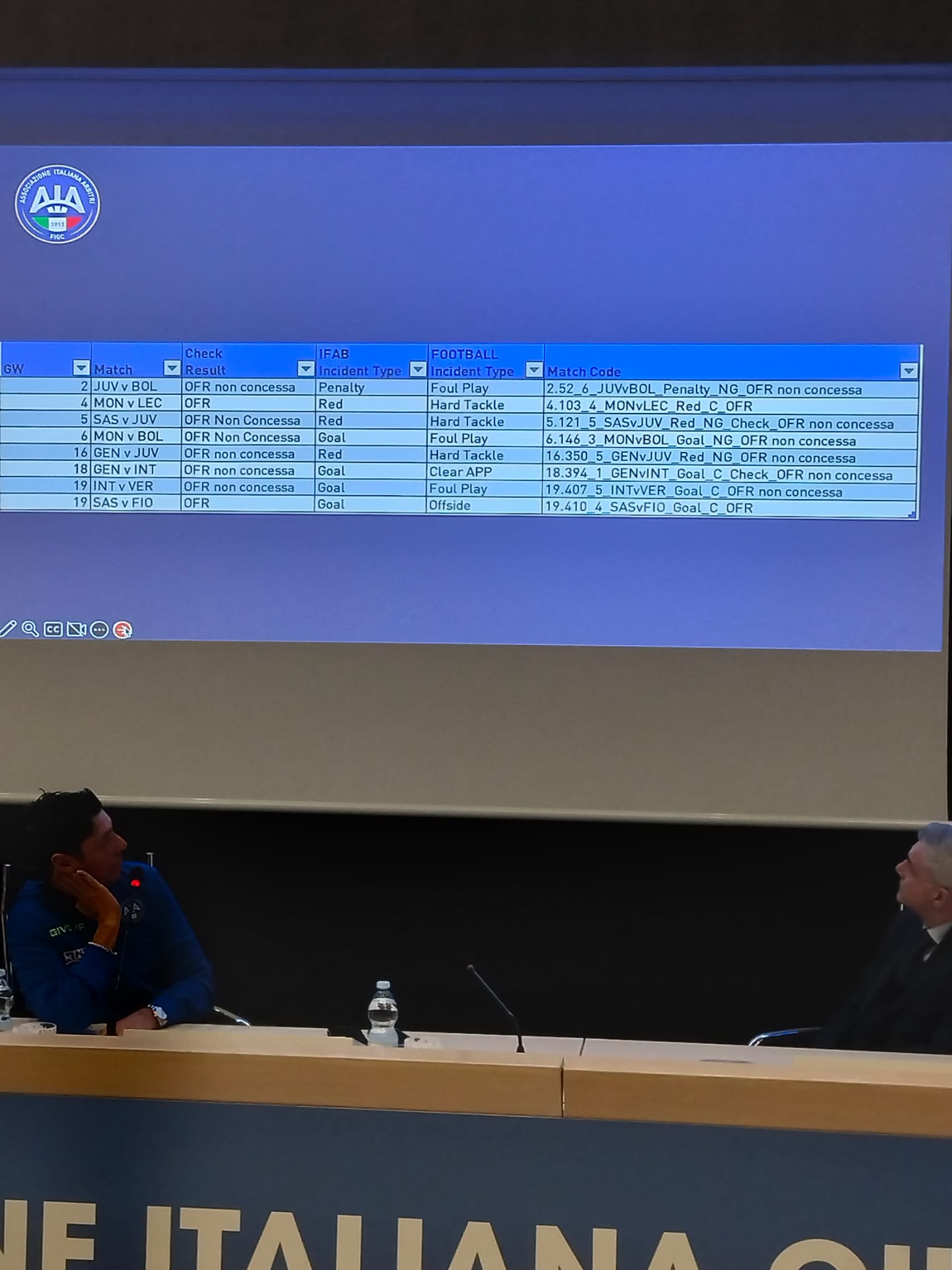 Otto errori gravi su settantotto interventi del VAR nel girone d'andata. È questo il bilancio tratteggiato da Gianluca Rocchi, responsabile della CAN A e B, nella conferenza stampa di oggi. Il designatore ha rivisto in maniera analitica le occasioni in cui si è resa - o sarebbe stata - necessaria una On Field Review. E ha rivelato in quali occasioni, a giudizio della commissione arbitrale, il VAR non ha corretto l'errore. O lo ha addirittura creato.