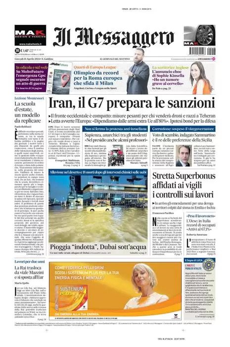 "Olimpico da record per la Roma europea che sfida il Milan". Così titola oggi in taglio alto Il Messaggero. Stasera si gioca il ritorno dei quarti di finale di Europa League, con i giallorossi che ricevono i rossoneri e verranno trascinati dal loro pubblico. Si riparte dallo 0-1 dell'andata, che porta la firma di Mancini. De Rossi dice di non voler giocare per il pareggio, Pioli deve dare una sterzata dopo le ultime prove dei suoi non all'altezza.