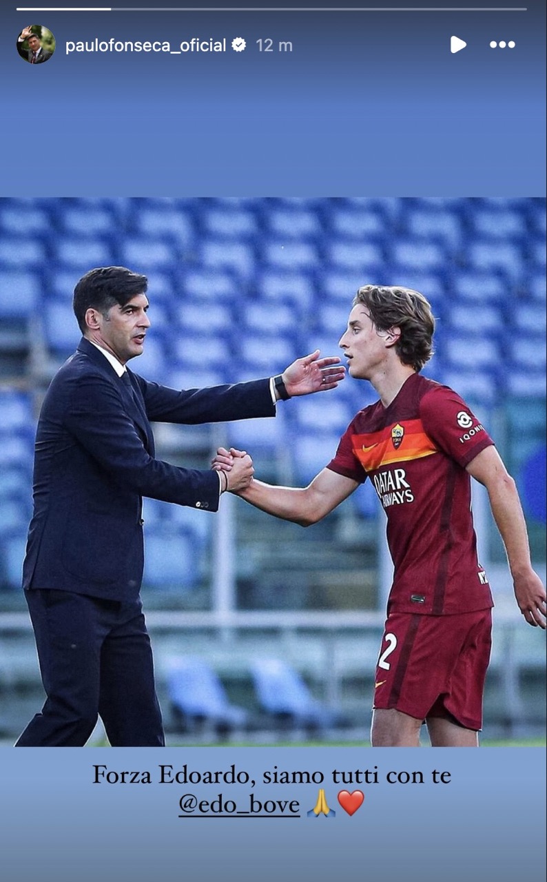 Il portoghese ha pubblicato una foto con il ragazzo proprio risalente ai tempi in giallorosso nelle storie di Instagram e ha scritto: "Forza Edoardo, siamo tutti con te". Accanto anche un cuore. Fonseca aveva regalato la gioia dell'esordio ufficiale a Bove con la maglia della Roma tra i professionisti: era il 9 maggio 2021 e i giallorossi vinsero 5-0 con il Crotone all'Olimpico nel corso della 35esima giornata di campionato. Bove entrò a undici minuti dal termine.