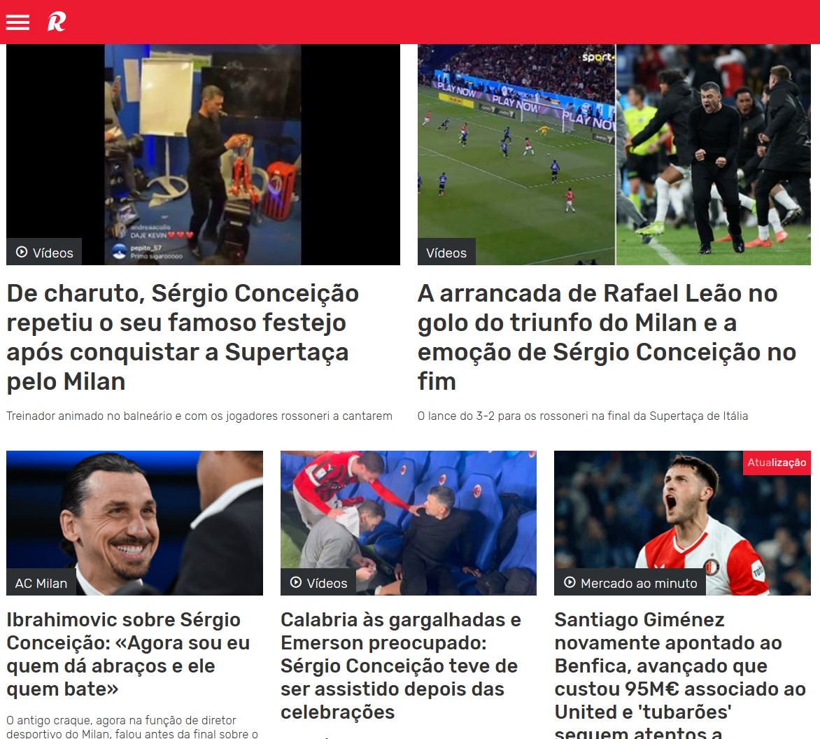 Tutti pazzi di Sergio Conceiçao. In Portogallo i tre principali quotidiani sportivi del Paese hanno dedicato ampio spazio alla Supercoppa Italiana, vinta dal Milan con una clamorosa rimonta da 0-2 a 3-2 e che ha nel condottiero ex Porto il grande artefice. Evidenziata anche la grande prestazione di Rafa Leao.