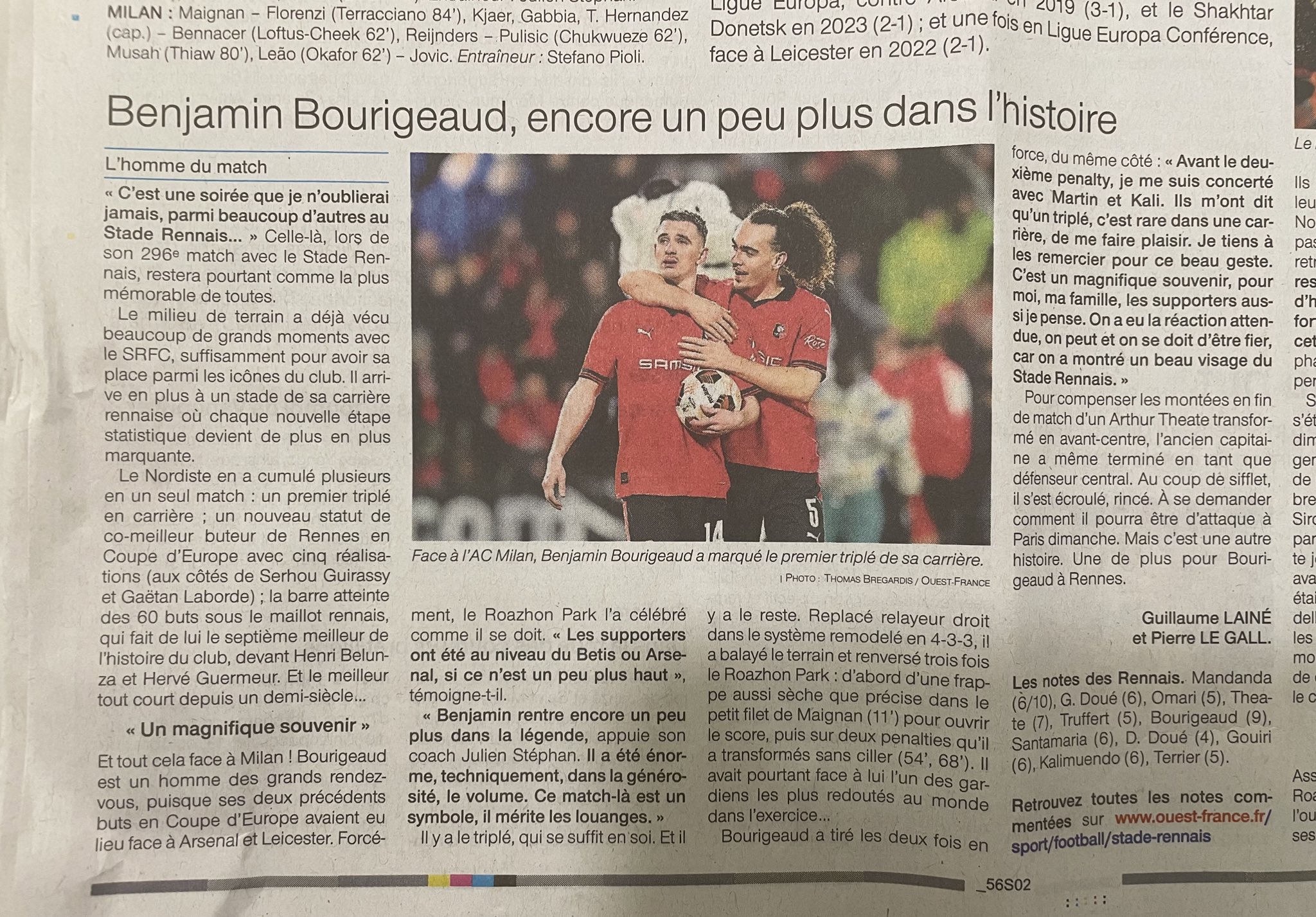 L’@OuestFrance titola: “Il Rennes si arrende, ma il momento resterà”. La vittoria di ieri contro il #Milan, nonostante l’eliminazione, è per i francesi un “souvenir di prestigio” e, come ha detto Stephan, “la più bella vittoria… pic.twitter.com/COHwmiuK94
