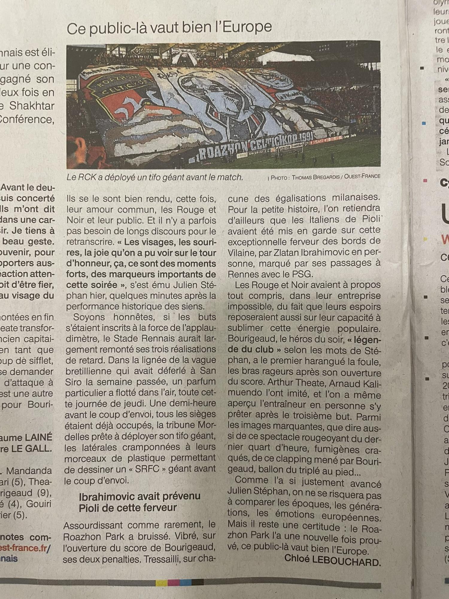 A impressionare, oltre all’eroe Borigeaud , a cui è stato dedicato un articolo di elogio, è stato il pubblico del Roazhon Park, pazzesco per tutta la partita; addirittura, il collega francese Lebouchard scrive: “Ibrahimovic aveva messo in guardia Pioli di questo fervore” avendo affrontato i bretoni con la maglia del PSG.