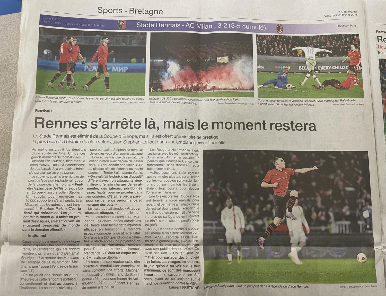 L'OuestFrance, il quotidiano più importante di Rennes e della Bretagna, titola: “Il Rennes si arrende, ma il momento resterà”.