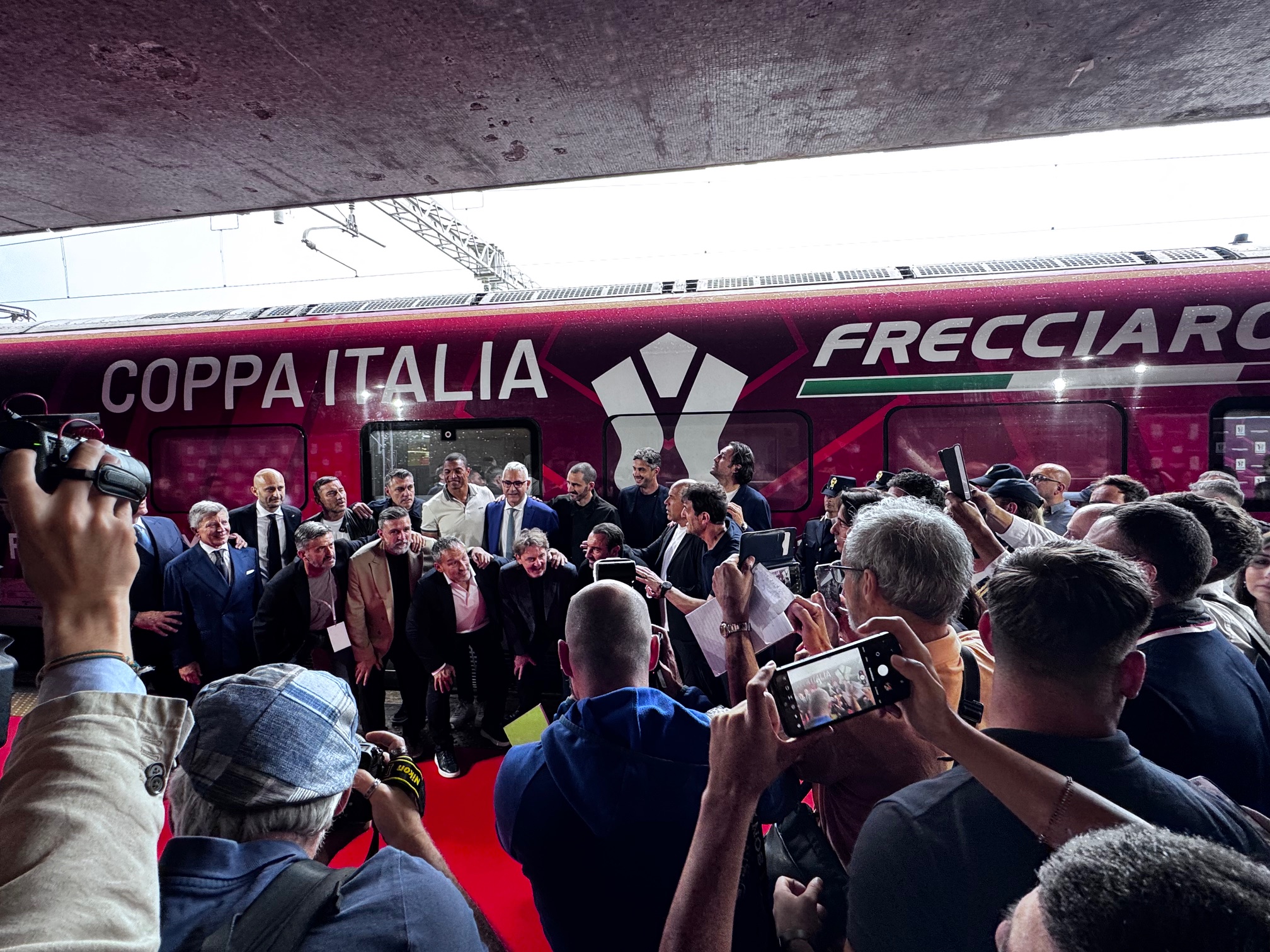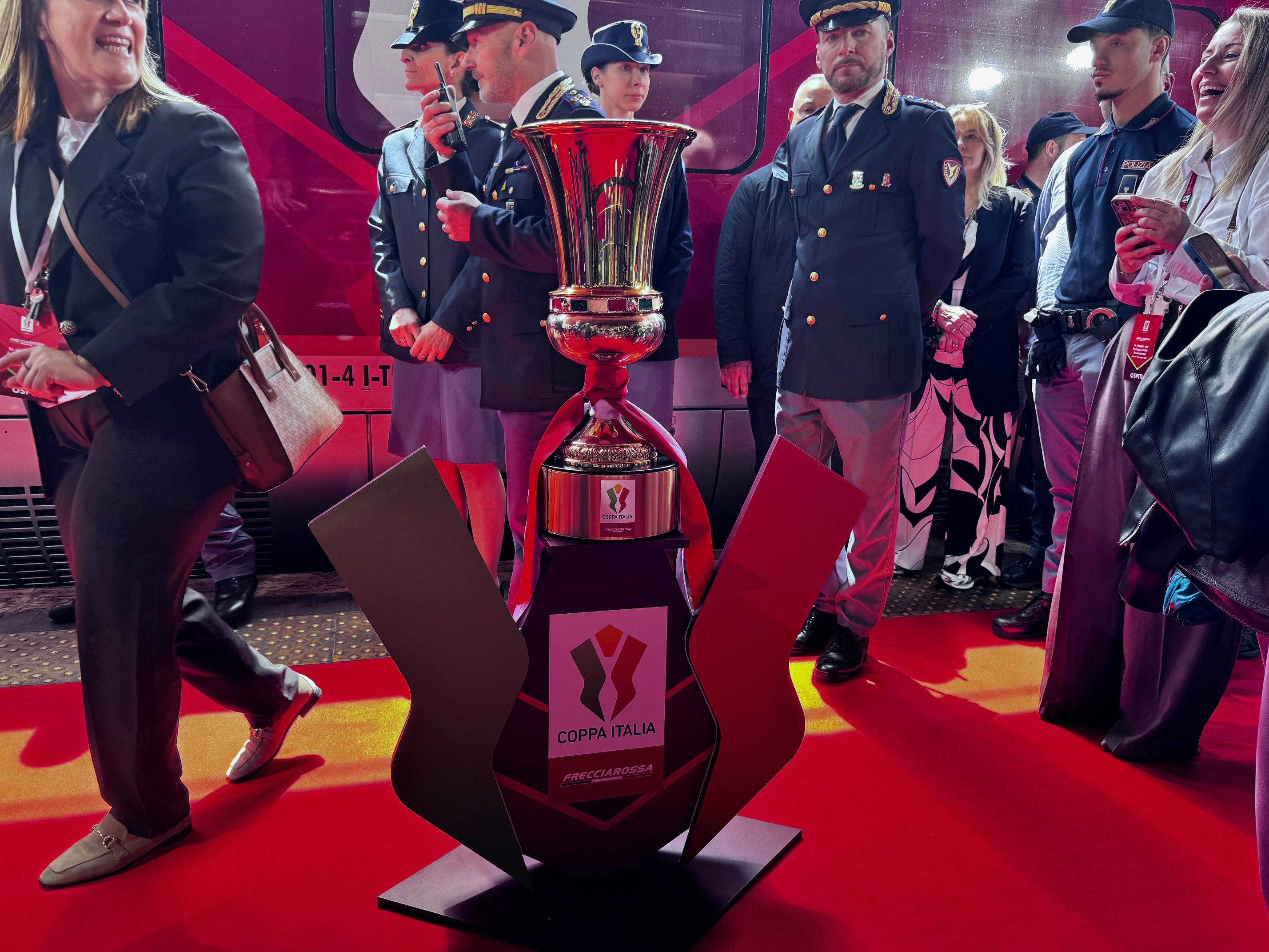 Alla stazione di Termini, a Roma, è appena giunta la Coppa Italia che domani sarà in palio per l'ultimo atto della competizione, che all'Olimpico metterà diu fronte il Milan di Sergio Conceicao e il Bologna di Vincenzo Italiano.