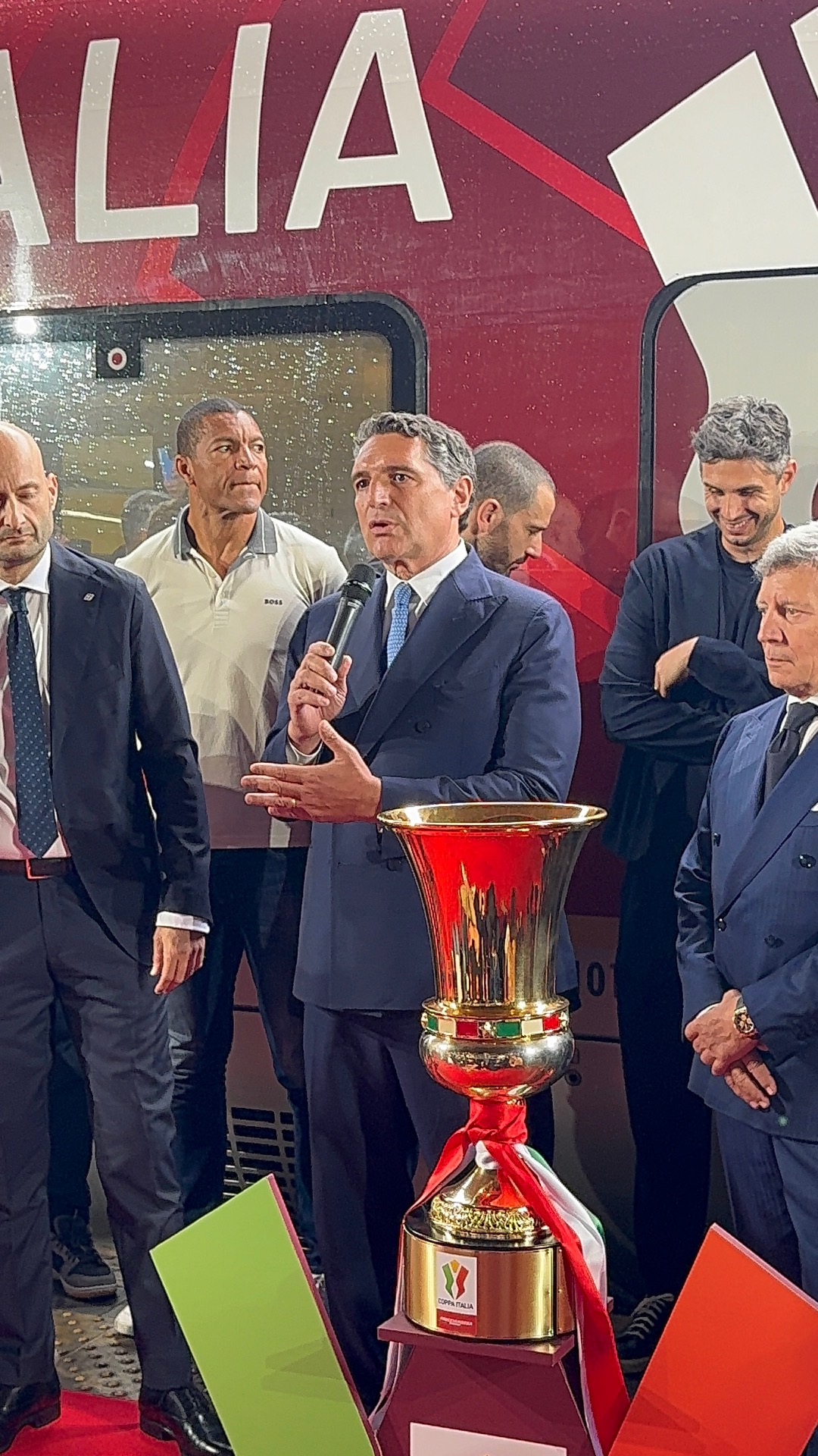 Quest'ultimo ha preso la parola nel corso dell'evento: "Oggi, assieme al nostro partner Freccia Rossa, festeggiamo una grande edizione della Coppa Italia. Quest'anno stiamo assistendo ad un campionato straordinario, che si chiuderà nelle ultime due giornate, ma la Coppa Italia non è stata da meno, vi partecipano tutte le squadre di Serie A, di Serie B e le più importanti di Serie C. Il Bologna dopo 51 anni torna a disputare una finale e sarà seguito da 30mila tifosi rossoblù, così come quelli del Milan. Sarà una grande festa di sport. Oggi il presidente della Repubblica Sergio Mattarella ha lanciato un bellissimo messaggio sui valori che i calciatori porteranno all'interno del terreno di gioco".