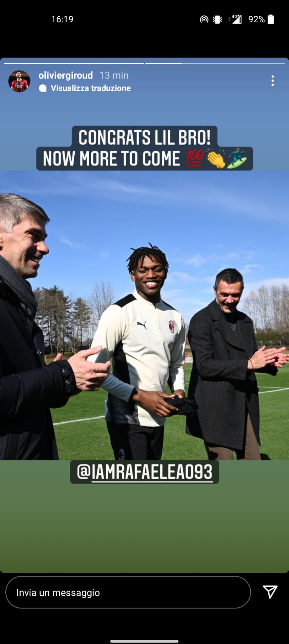 Oggi il portoghese è stato premiato dalla dirigenza a Milanello per il traguardo raggiunto; Olivier Giroud si è congratulato su Instagram con il suo compagno di squadra: "Congratulazioni fratellino! Ora ne arriveranno altre".