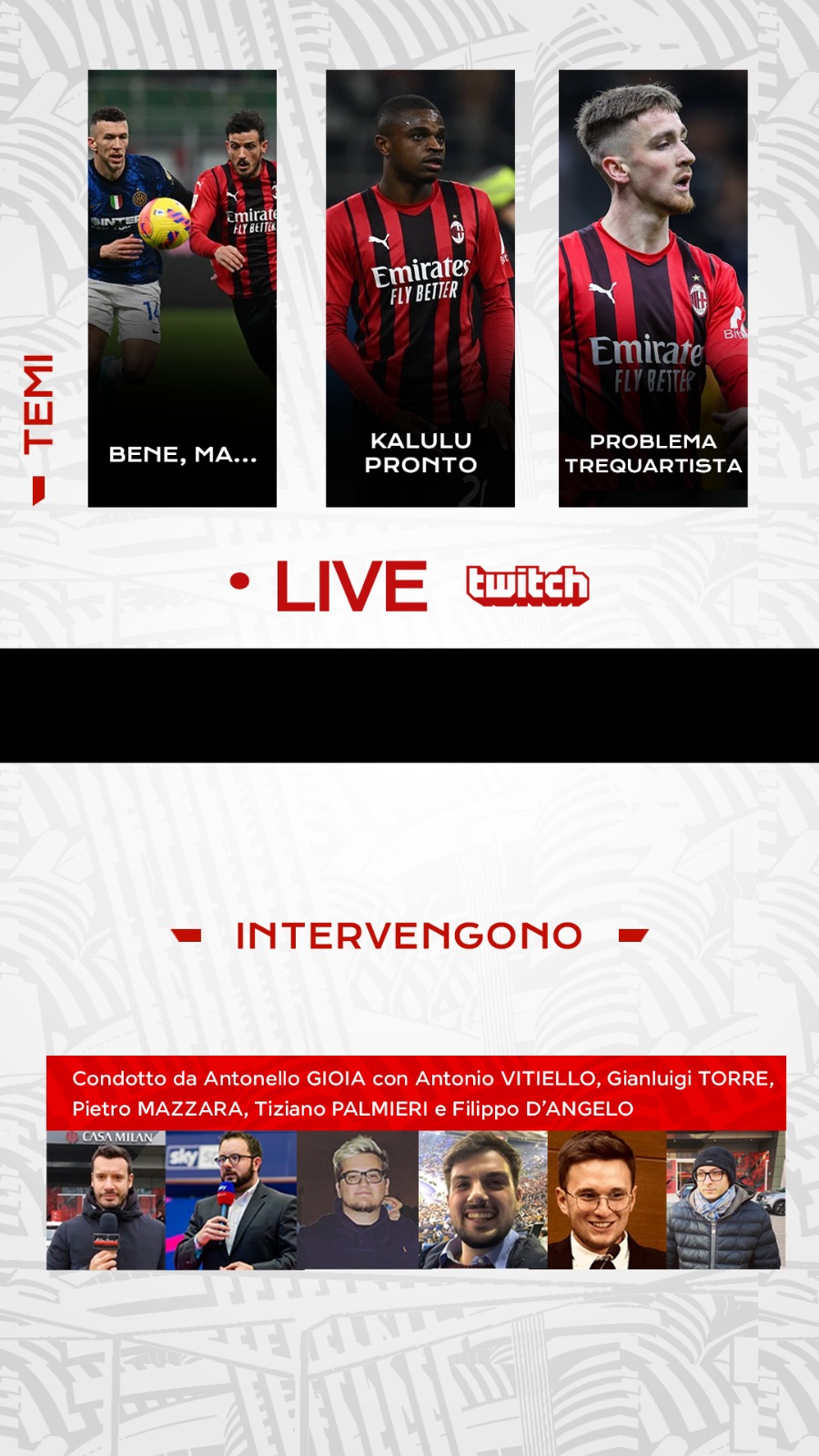 A partire dalle 19:00 saremo in diretta sul nostro canale Twitch (CLICCA QUI per ACCEDERE al CANALE) per discutere e commentare assieme a voi tutto ciò che riguarda il mondo Milan!