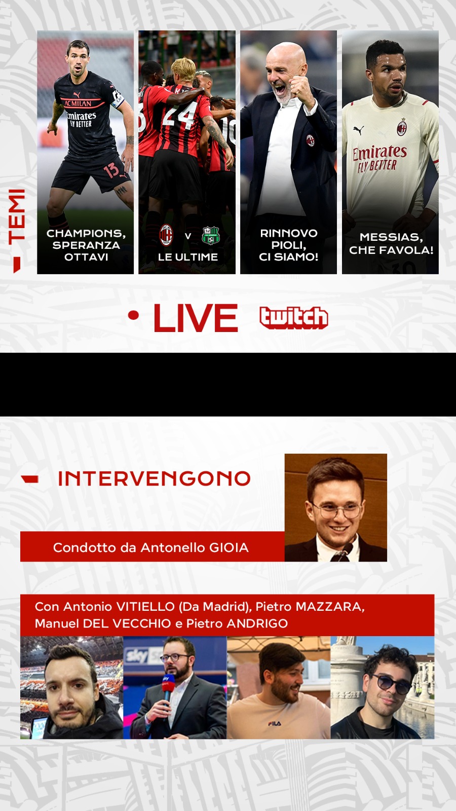 LIVE MN - Dalle 19 siamo in diretta su Twitch! I temi: Champions, ci crediamo? Le ultime pre Sassuolo. Pioli, è rinnovo!