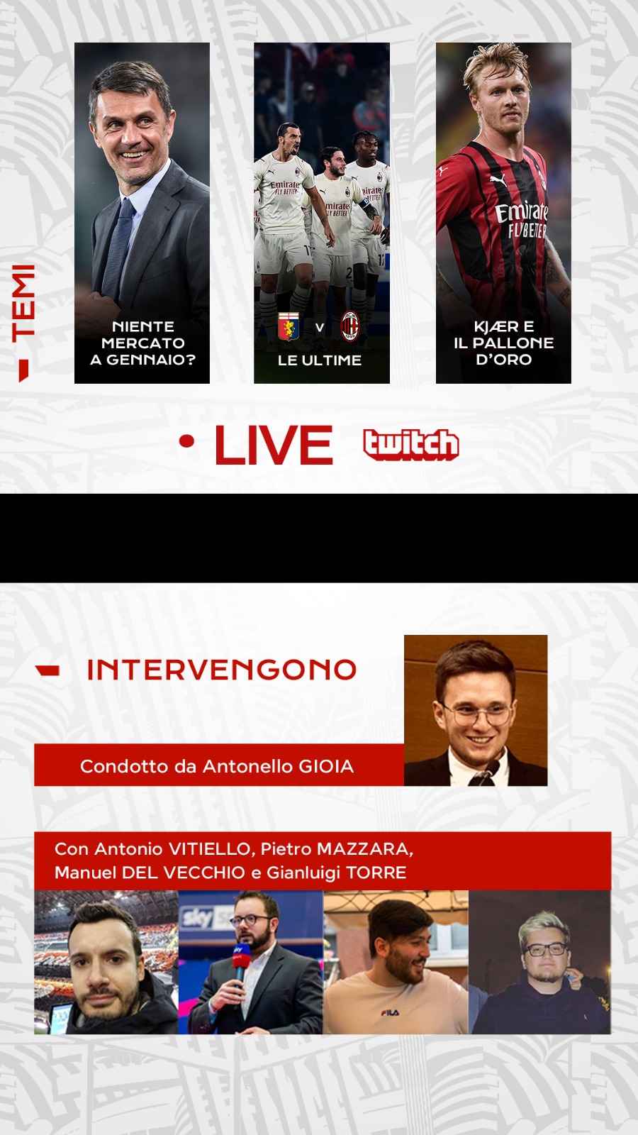 A partire dalle 19:00 saremo in diretta sul nostro canale Twitch (CLICCA QUI per ACCEDERE al CANALE) per discutere e commentare assieme a voi tutto ciò che riguarda il mondo Milan!