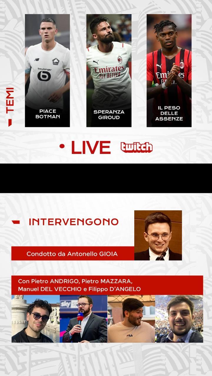 A partire dalle 19:00 saremo in diretta sul nostro canale Twitch (CLICCA QUI per ACCEDERE al CANALE) per discutere e commentare assieme a voi tutto ciò che riguarda il mondo Milan!
