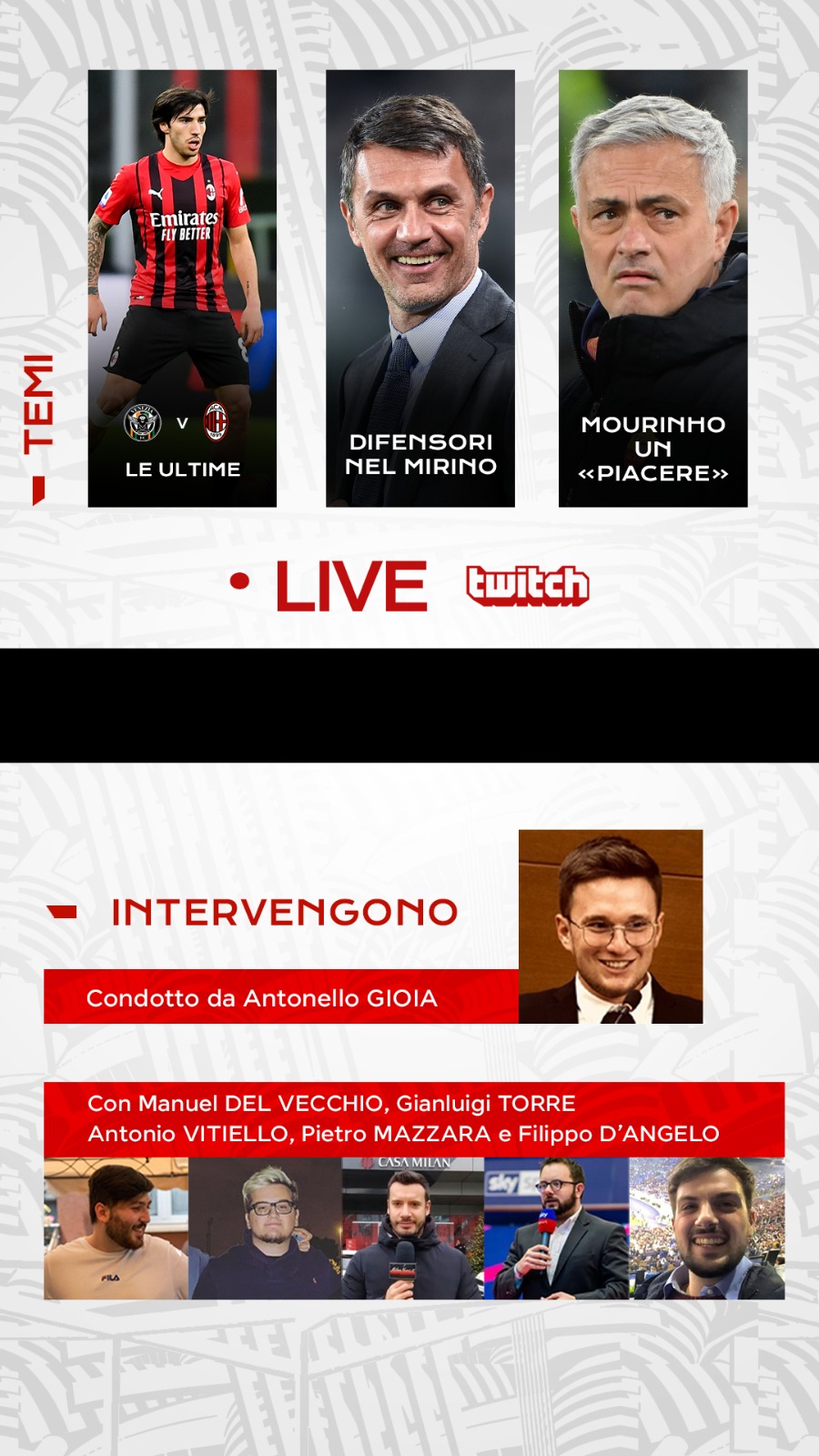A partire dalle 19:00 saremo in diretta sul nostro canale Twitch (CLICCA QUI per ACCEDERE al CANALE) per discutere e commentare assieme a voi tutto ciò che riguarda il mondo Milan!