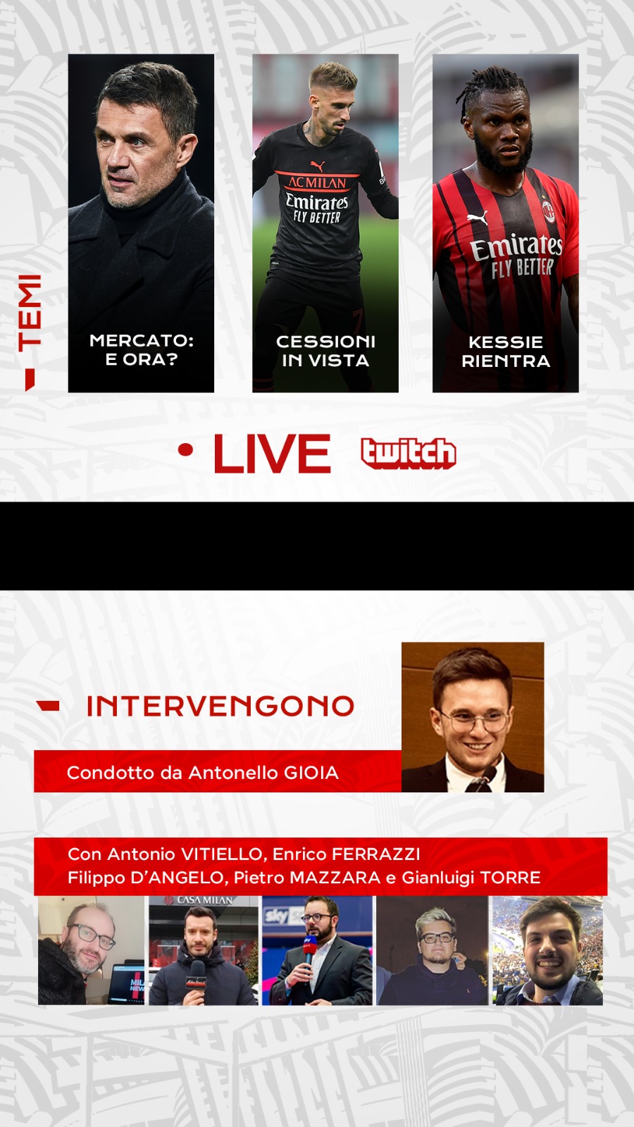 A partire dalle 19:00 saremo in diretta sul nostro canale Twitch (CLICCA QUI per ACCEDERE al CANALE) per discutere e commentare assieme a voi tutto ciò che riguarda il mondo Milan!