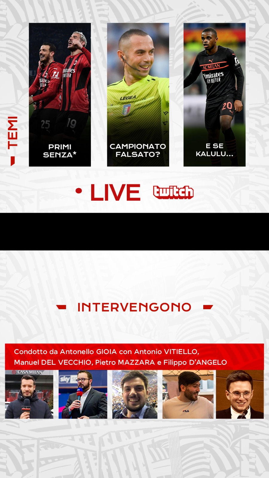 A partire dalle 19:00 saremo in diretta sul nostro canale Twitch (CLICCA QUI per ACCEDERE al CANALE) per discutere e commentare assieme a voi tutto ciò che riguarda il mondo Milan!