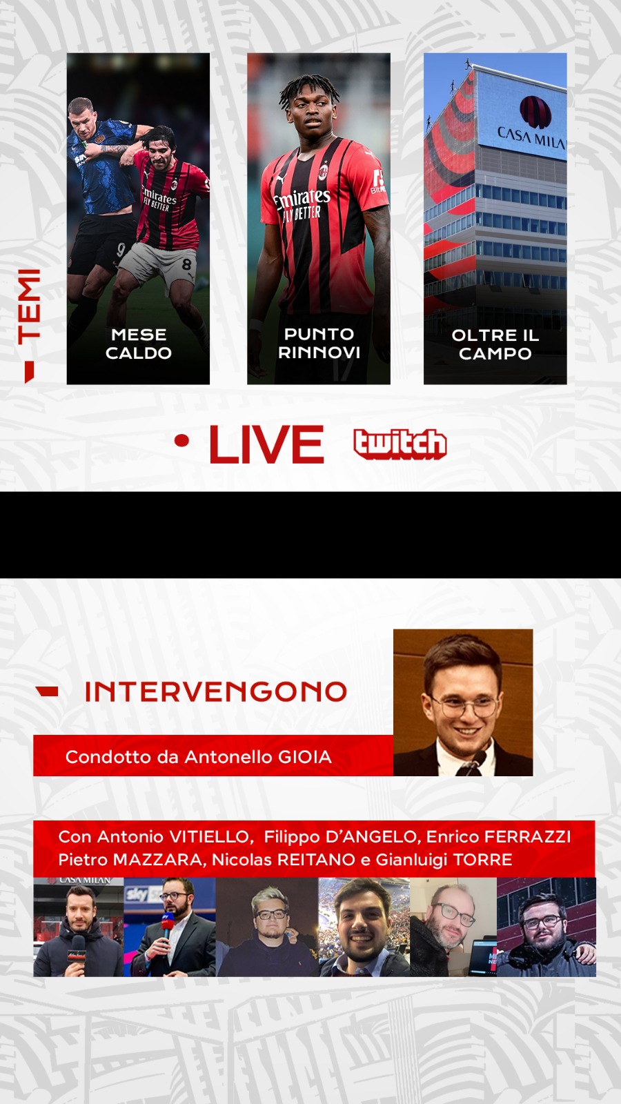 A partire dalle 19:00 saremo in diretta sul nostro canale Twitch (CLICCA QUI per ACCEDERE al CANALE) per discutere e commentare assieme a voi tutto ciò che riguarda il mondo Milan!
