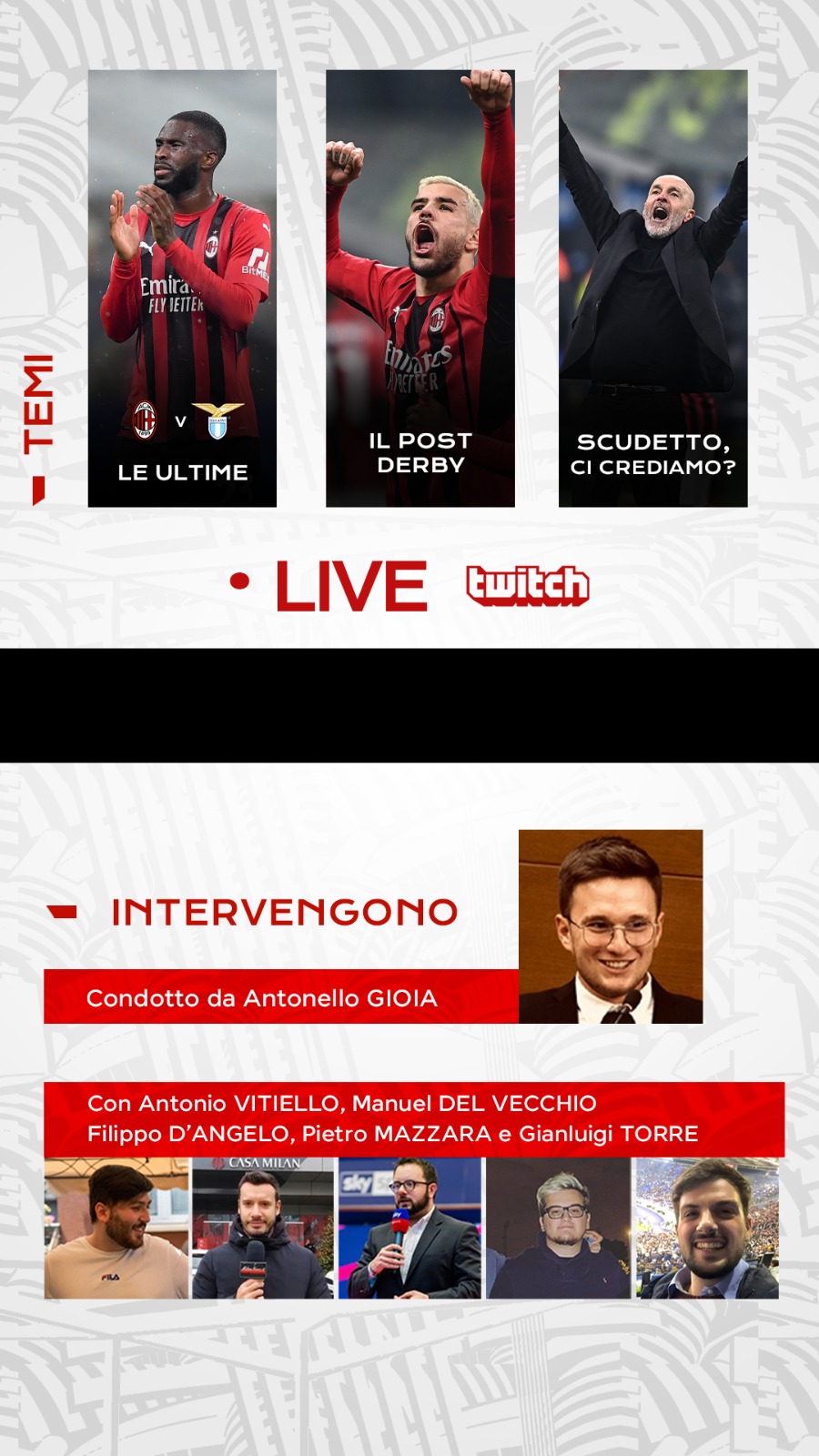 A partire dalle 19:00 saremo in diretta sul nostro canale Twitch (CLICCA QUI per ACCEDERE al CANALE) per discutere e commentare assieme a voi tutto ciò che riguarda il mondo Milan!