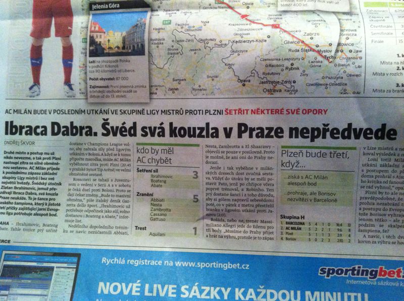 MilanNews è a Praga per seguire Plzen-Milan valevole per l'ultima giornata di Champions. I media nazionali danno risalto al match di domani sera, gara che per i cechi è molto importante soprattutto per raggiungere la qualificazione alla fase successiva di Europa League. Nell'ultima giornata di Gambrinus Liga disputata ieri, il Viktoria ha vinto 4 a 1 in casa contro il Bohemians 1905. Anche per i giornalisti cechi Zlatan Ibrahimovic è Ibraca Dabra, come scrive il titolo del quotidiano 'Sport', "Ibracadabra porta la magia a Praga".