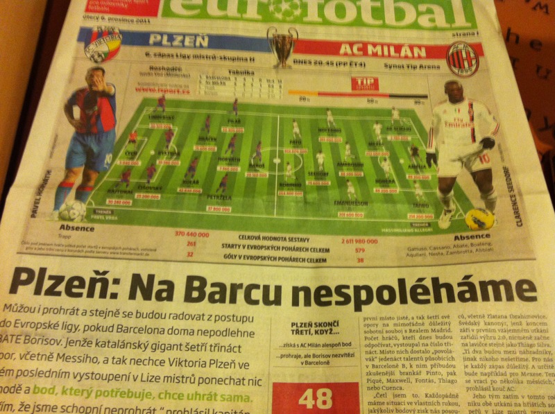 Il principale quotidiano ceco 'Sport' oggi pubblica uno speciale inserto dedicato alla sfida di questa sera tra Plzen e Milan. Il titolo principale segnala come il Viktoria tema i rossoneri ma allo stesso tempo punti alla qualificazione. I cechi per qualificarsi hanno bisogno di un punto, difficile per i media nazionali che questo punto la squadra di Vrba lo possa ottenere contro il Milan: 'Plzen: devi contare sul Barca".
