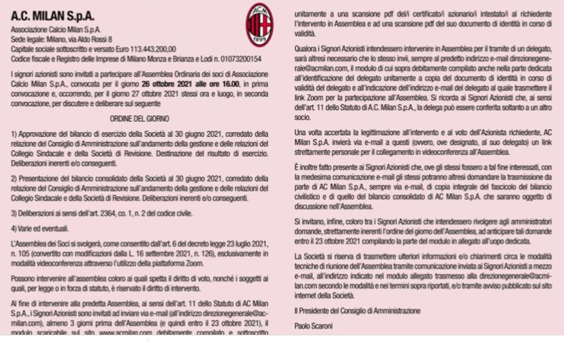 Il Milan, sulle pagine odierne della Gazzetta dello Sport, ha pubblicato l'annuncio della convocazione dell'Assemblea Ordinaria dei Soci per il giorno 26 ottobre 2021 alle 16 in prima convocazione e, occorrendo, per il giorno 27 ottobre 2021 alla stessa ora in seconda convocazione. Tra i punti all'ordine del giorno, ci sono l'approvazione del bilancio di esercizio della società al 30 giugno 2021 e la presentazione del bilancio consolidato del club sempre al 30 giugno 2021.
