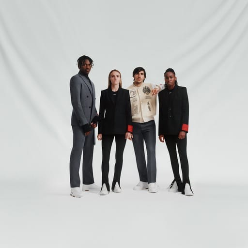 Il completo formale è composto da una giacca a doppio petto dall’apparenza classica nella parte anteriore. Sul retro invece sono presenti due strisce verticali e il numero della calciatrice o del calciatore. I pantaloni, in stile consono a un abito elegante, sono contraddistinti da risvolti e da una scritta sulla gamba sinistra che, con la classica ironia Off-White™, descrive il capo con la citazione “Uniform”.