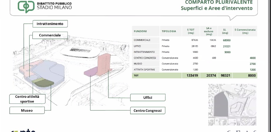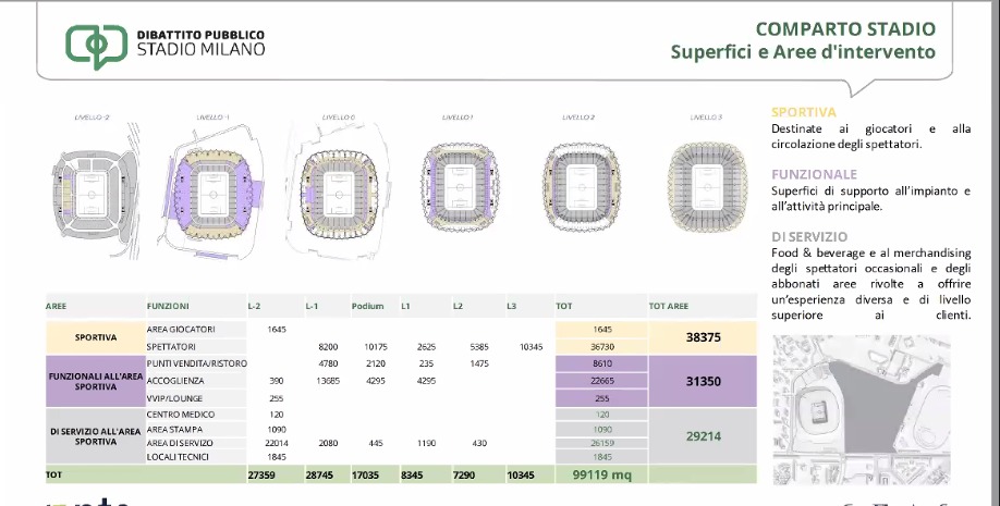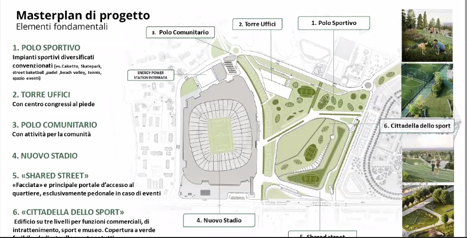 Nel corso del primo incontro del dibattito pubblico per la realizzazione del nuovo impianto di Milan ed Inter, le due società hanno presentato il masterplan del progetto meneghino. Come si può osservare nelle foto che seguono, l'area del nuovo stadio (di circa 133mila mq) sarà suddivisa in più zone: il polo sportivo (con impianti sportivi diversificati,), la torre-uffici (con un certo congressi al piede), il polo comunitario (per le attività della comunità), la shared street (portale d'accesso al quartiere), lo stadio e la cittadella dello sport (un edificio 'verde' su tre livelli).