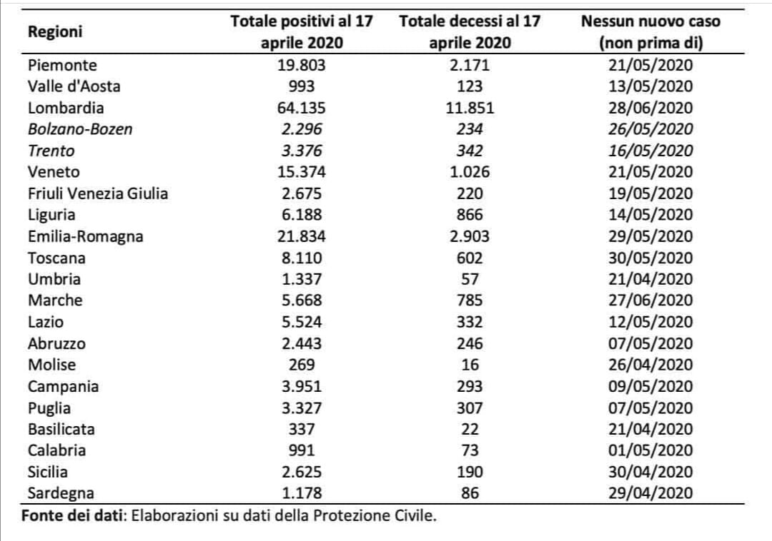 La fine dell’emergenza Covid-19 in Italia potrebbe avere tempistiche diverse nelle Regioni a seconda dei territori più o meno esposti all’epidemia: in Lombardia e Marche, verosimilmente, l’assenza di nuovi casi si potrà verificare non prima della fine di giugno, in Emilia-Romagna e Toscana non prima della fine di maggio. Nelle altre Regioni l’azzeramento dei contagi potrebbe avvenire tra la terza settimana di aprile e la prima settimana di maggio.