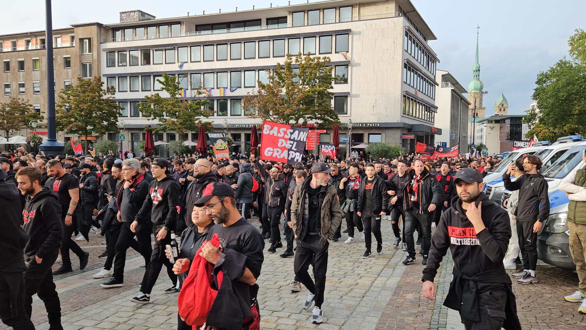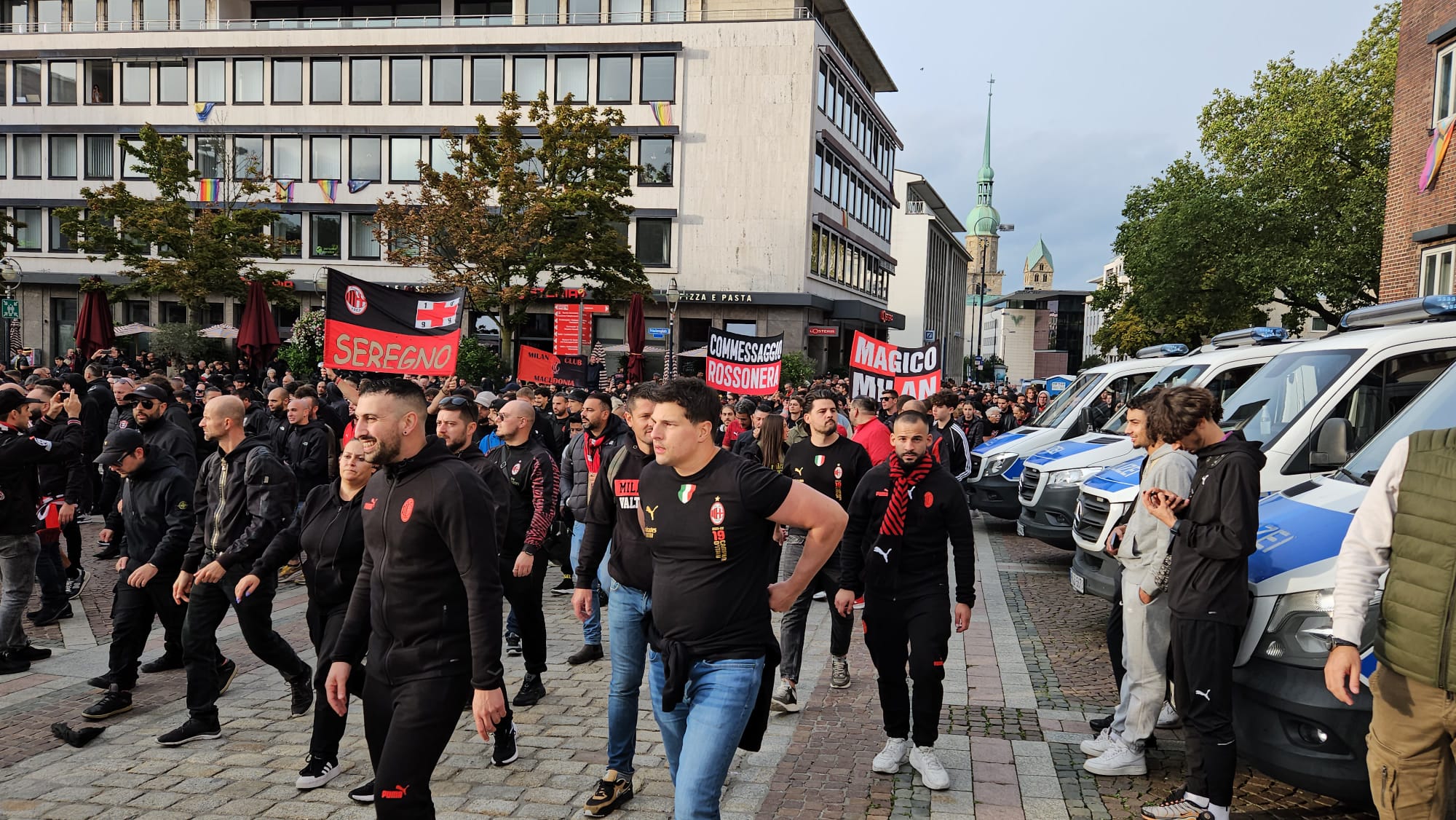 Ecco alcune foto scattate dall'inviato di Milannews.it del corteo della Curva Sud Milano che a Dortmund sta raggiungendo a piedi il Signal Iduna Park, lo stadio dove alle 21.00 il Milan di Stefano Pioli affronterà il Borussia Dortmund nella seconda giornata del Girone F di Champions League: