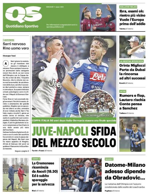 L'edizione odierna del Quotidiano Sportivo titola così questa mattina in prima pagina sul Milan: "Ibra, esami ok: rientro più vicino. Vuole l'Europa prima dell'addio". Prosegue bene il recupero di Ibrahimovic che punta a rientrare il 28 giugno contro la Roma. Nonostante il suo addio a fine stagione sia già scritto, lo svedese farà di tutto per riportare il Milan in Europa.