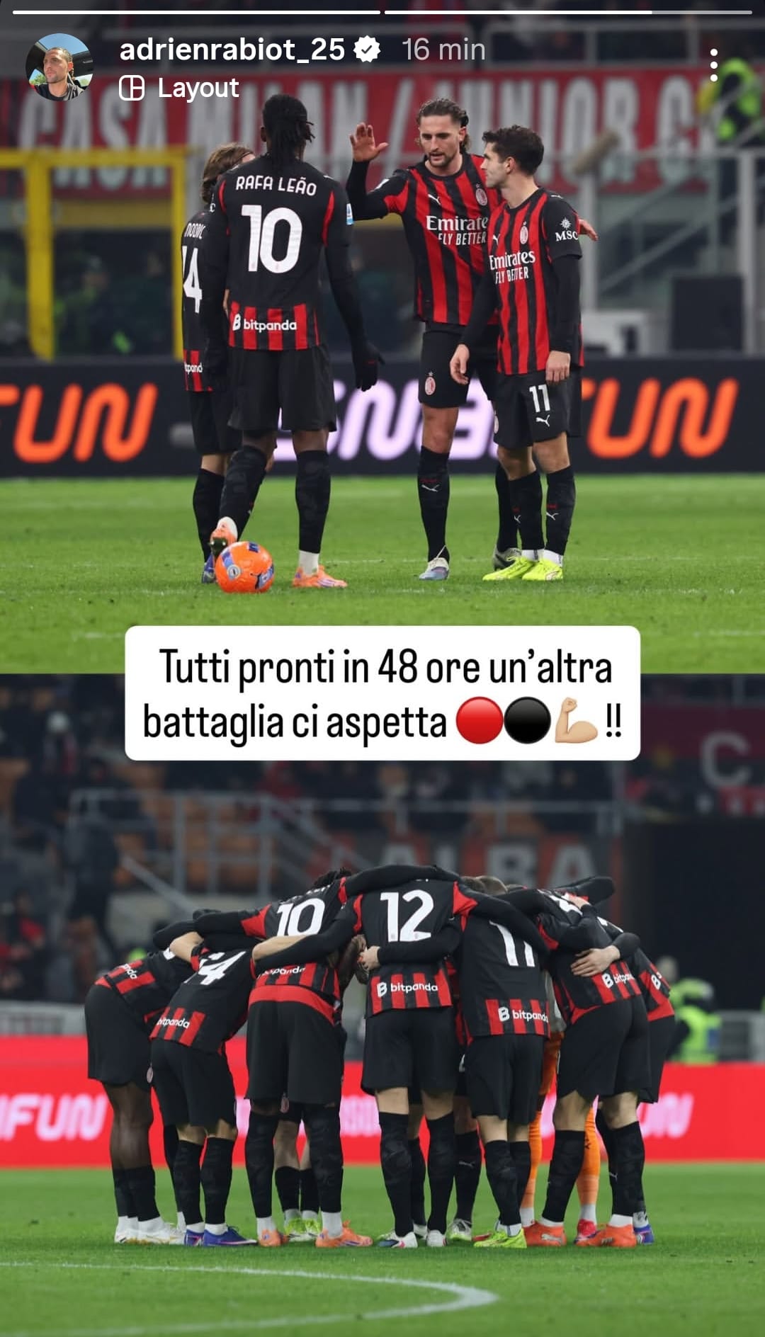 Adrien Rabiot, sempre più leader nel Milan di Max Allegri, ha pubblicato stamattina su Instagram una storia all'indomani dell'1-1 contro il Genoa per caricare l'ambiente rossonero in vista del prossimo impegno di campionato in programma domenica alle 15 in casa della Fiorentina: "Tutti pronti, in 48 ore un'altra battaglia ci aspetta".