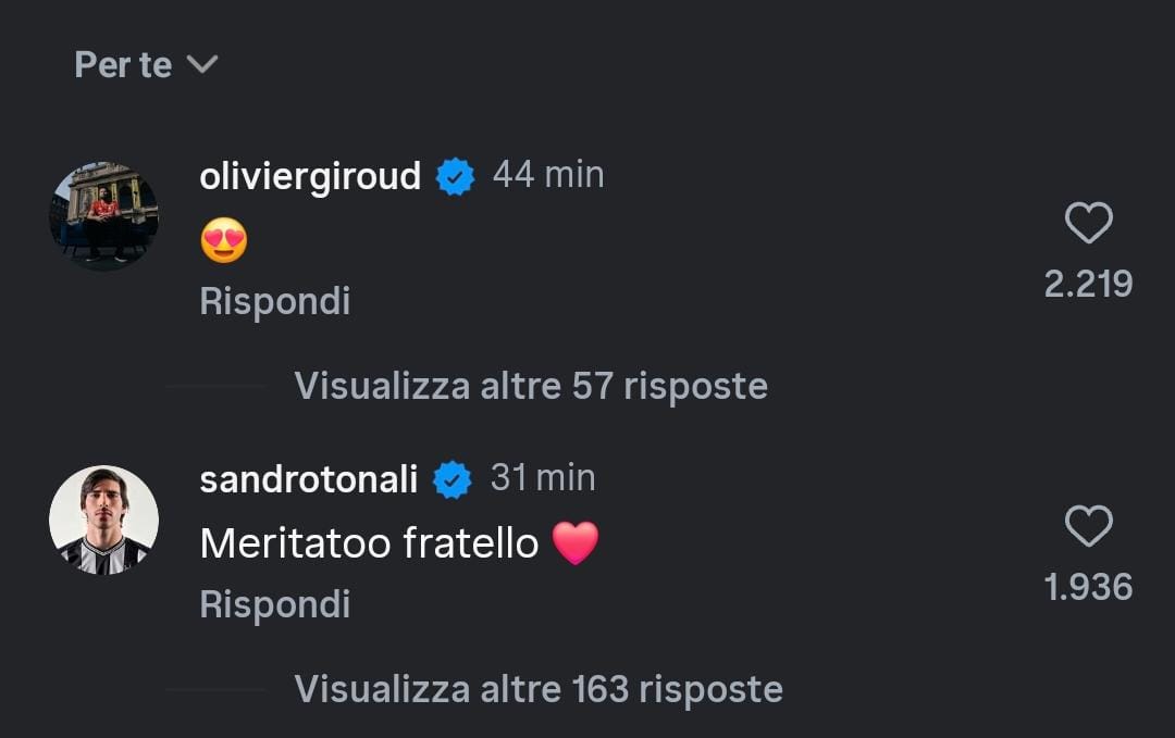 Sotto il post Instagram sono arrivati gli auguri di tanti amici ed ex compagni di squadra. Giroud ha commentato con un'emoji con gli occhi a cuoricino, Tonali ha commentato con un "Meritato fratello". Congratulazioni anche da parte di Calabria e Tomori, mentre Leao assicura che "arriveranno grandi cose".