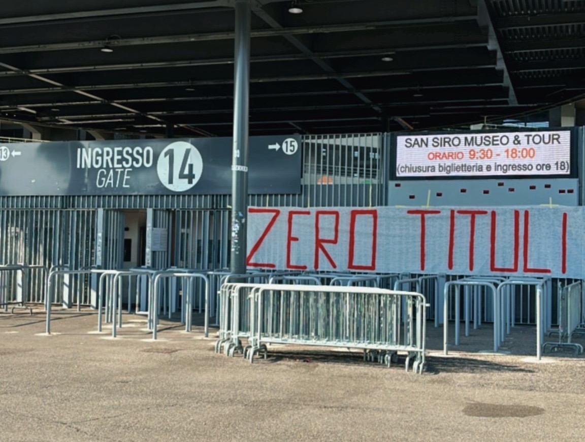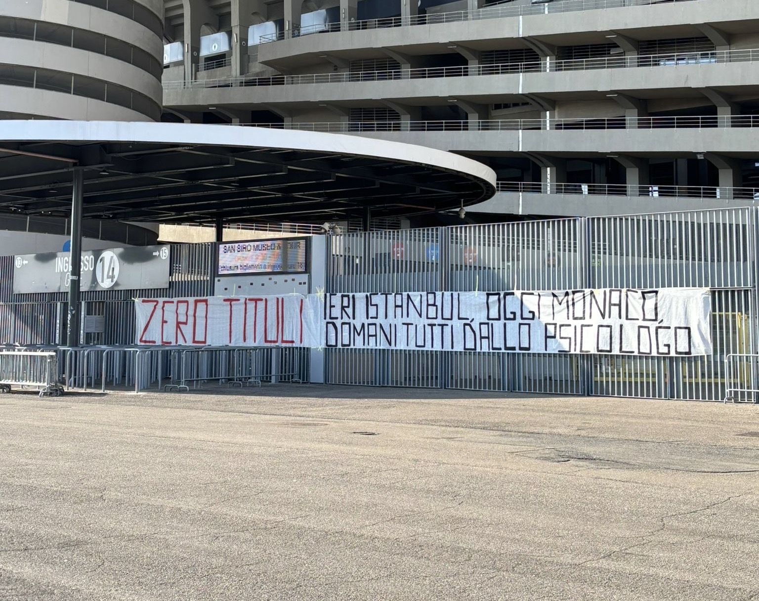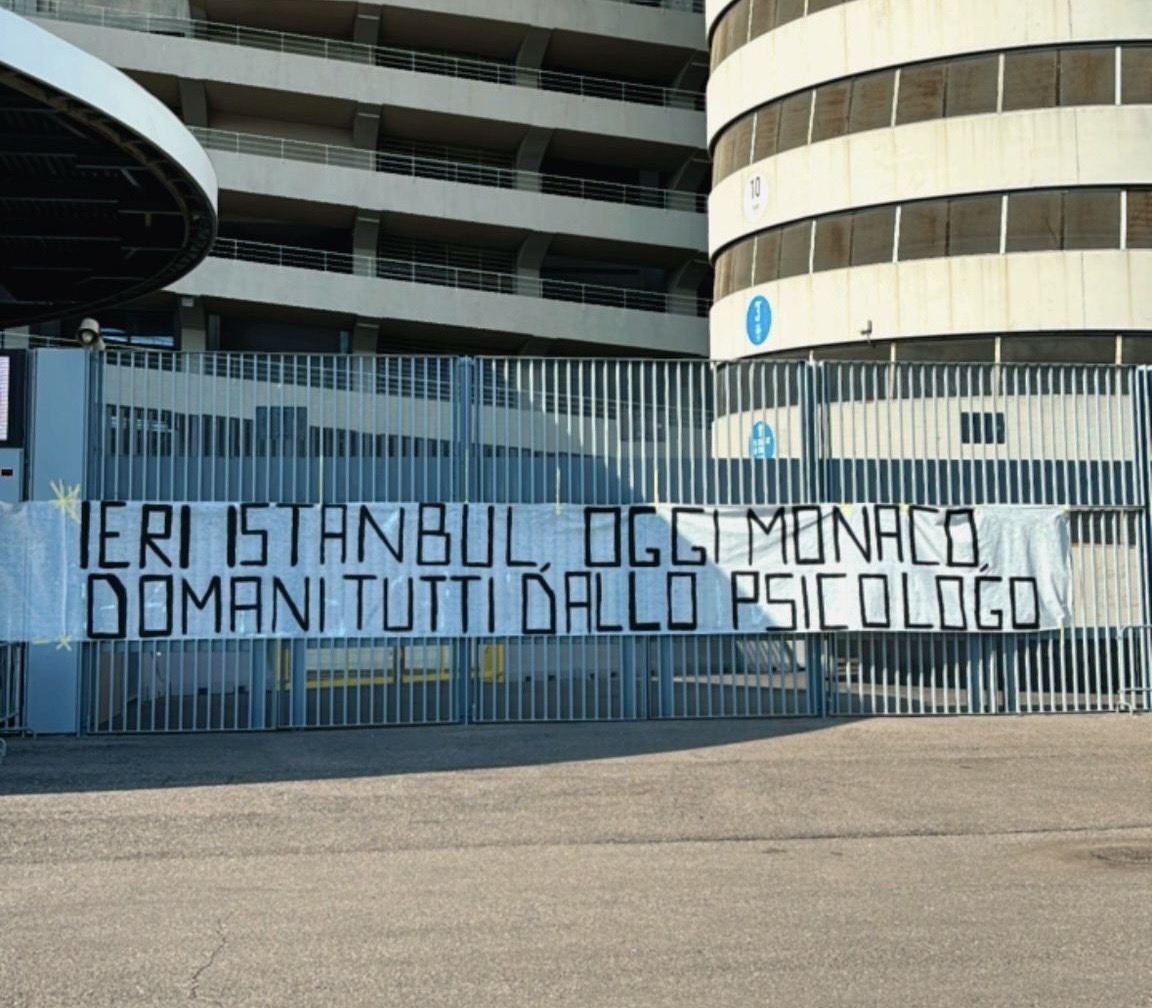 La Curva Sud non perdona e non ha perso l'occasione di rinfacciare ai "cugini" nerazzurri la sconfitta maturata ieri sera a Monaco. Nella giornata di oggi, infatti, sui cancelli di San Siro è comparso uno striscione all'indirizzo degli storici rivali interisti. Questo il messaggio: "Zero tituli. Ieri Istanbul, oggi Monaco, domani tutti dallo psicologo".